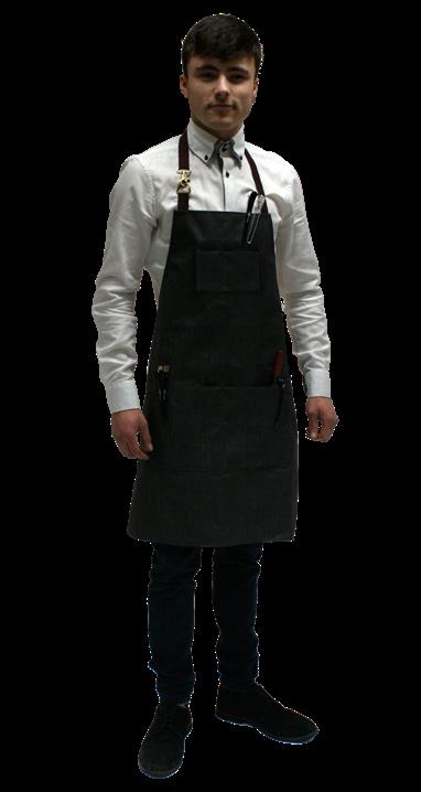 Barber apron with two front pockets. Adjustable straps with metal fastenings. Durable. Machine washable. Water-repellent.