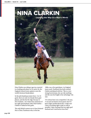 Nina Clarkin was riding at age two, married to a leading polo player at 24, and at 36, the England womenâs team captain is now the worldâs foremost female player. In the polo handicap system from -2 to 10 goals, there are only two female three-goal players, and she has the edge, because in New Zealand â her winter base and home of her eight-goal husband, John-Paul Clarkin â Clarkin is ranked at four goals. The only British woman ever to have bettered this is Claire Tomlinson who, in the late page 108