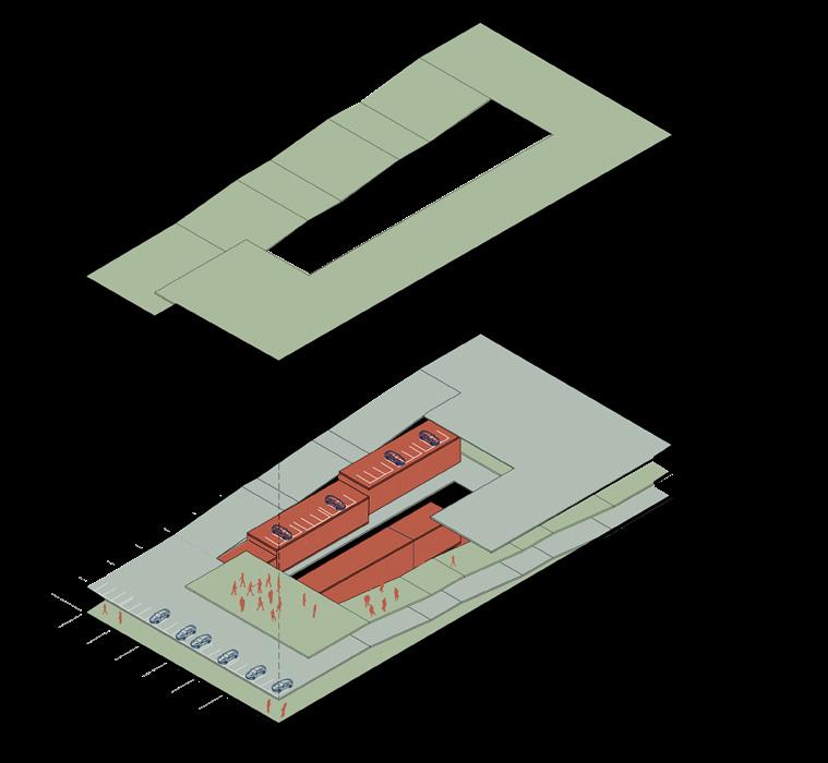 This project demonstrates the need to shift from a linear form of construction to a circular lifecycle. This project bases itself on the 9e Vie guidelines of circularity the city of Laval’s desire to gradually reduce car usage and transform Laval into a carfree urban environment. With the end goal of a car-free city, we propose a method of construction that phases out the parking lot in the building as its needs change. We demonstrate how the building is a prime example of a circular building typology shown through program, materials and design. Our design merges the flow of users and the flow of cars by integrating the parking infrastructure throughout our market, ultimately replacing parking spaces with functional building elements and programs as the building’s needs evolve.