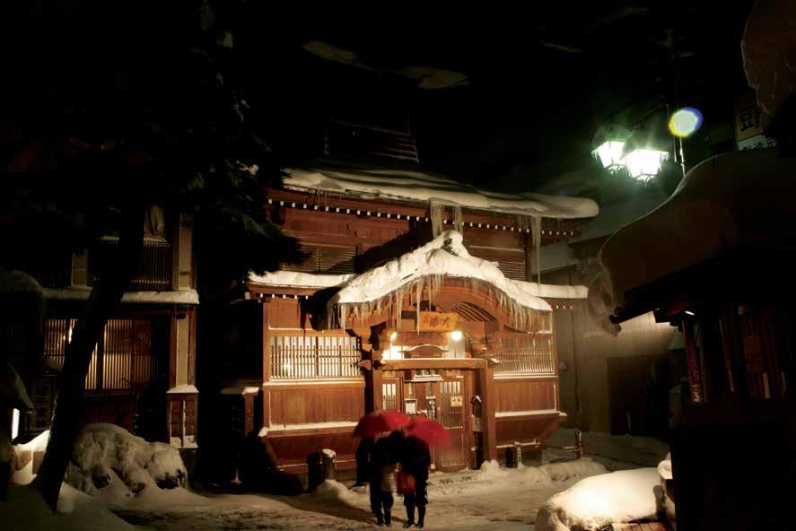 The expansive Soto-yu bathhouse in Nozawa Onsen is the largest among its counterparts. Housed in a temple-style building, this communal bathhouse o ers a grand and spacious bathing experience.