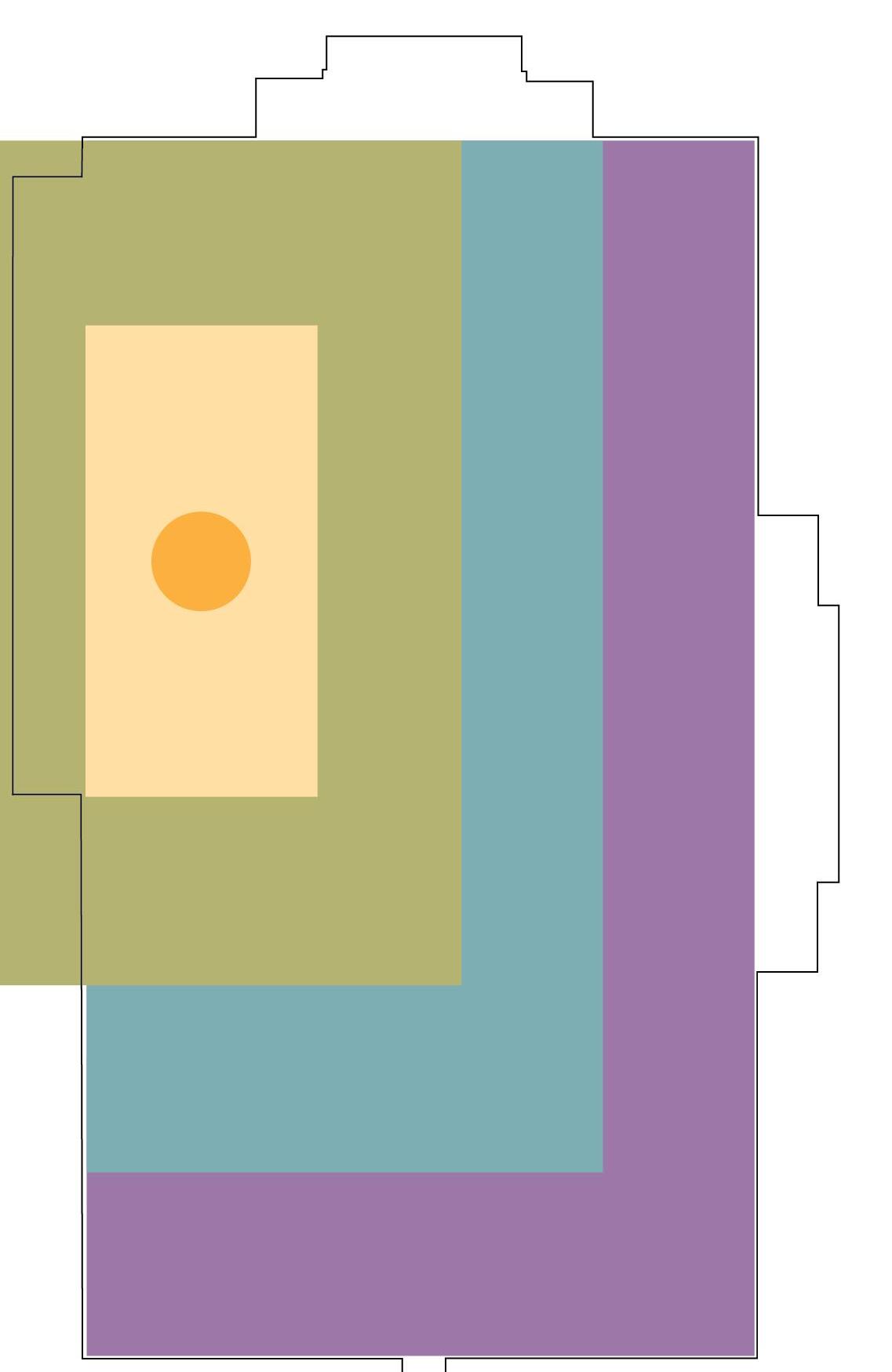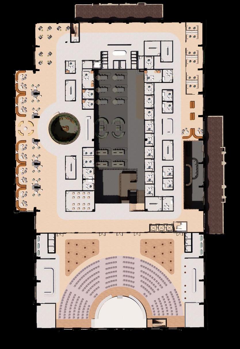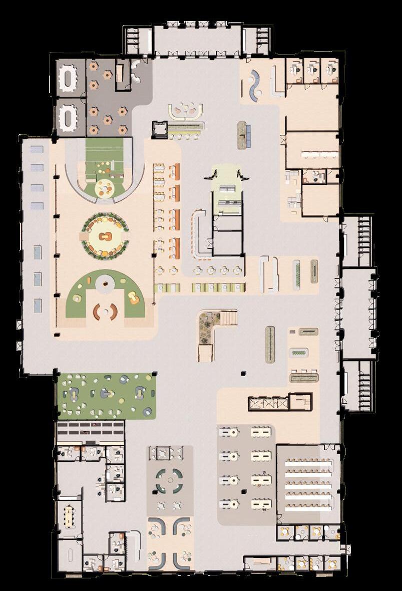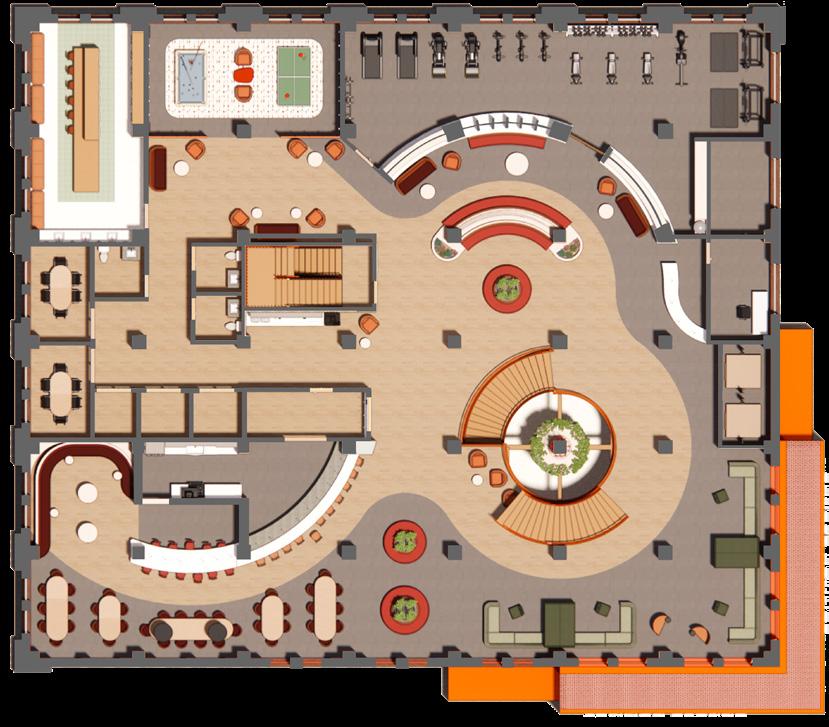The locus within the community commons acts as a source of activity and socialization which radiates throughout the surrounding spaces. The central space vertically penetrates the above floors, providing visual connections to the areas below. In correlation with our parti, the spaces which radiate around the locus become more private and less active. This energetic space is reflected on the exterior through the introduction of a more modern facade design, while still mainting elements of the historical structure.