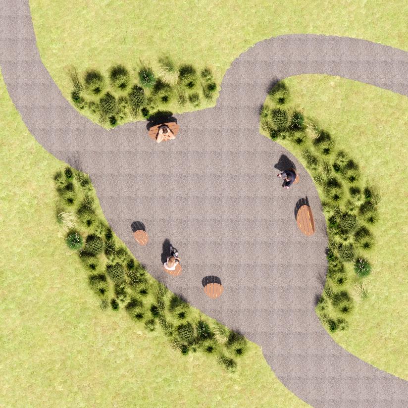 Each piece is weighted by a texturedconcrete mass, supported by steel vertical structure, and provides a softened wood touch point for each seat and back. Multiple small pieces within the site encourage and serve group settings as well as a comfortable atmosphere for individual use and peaceful reflection.