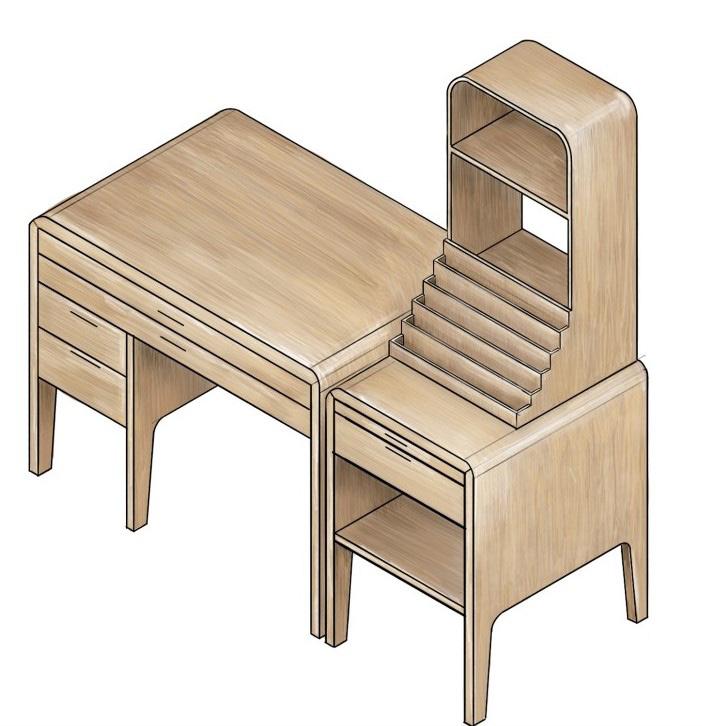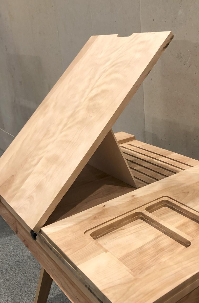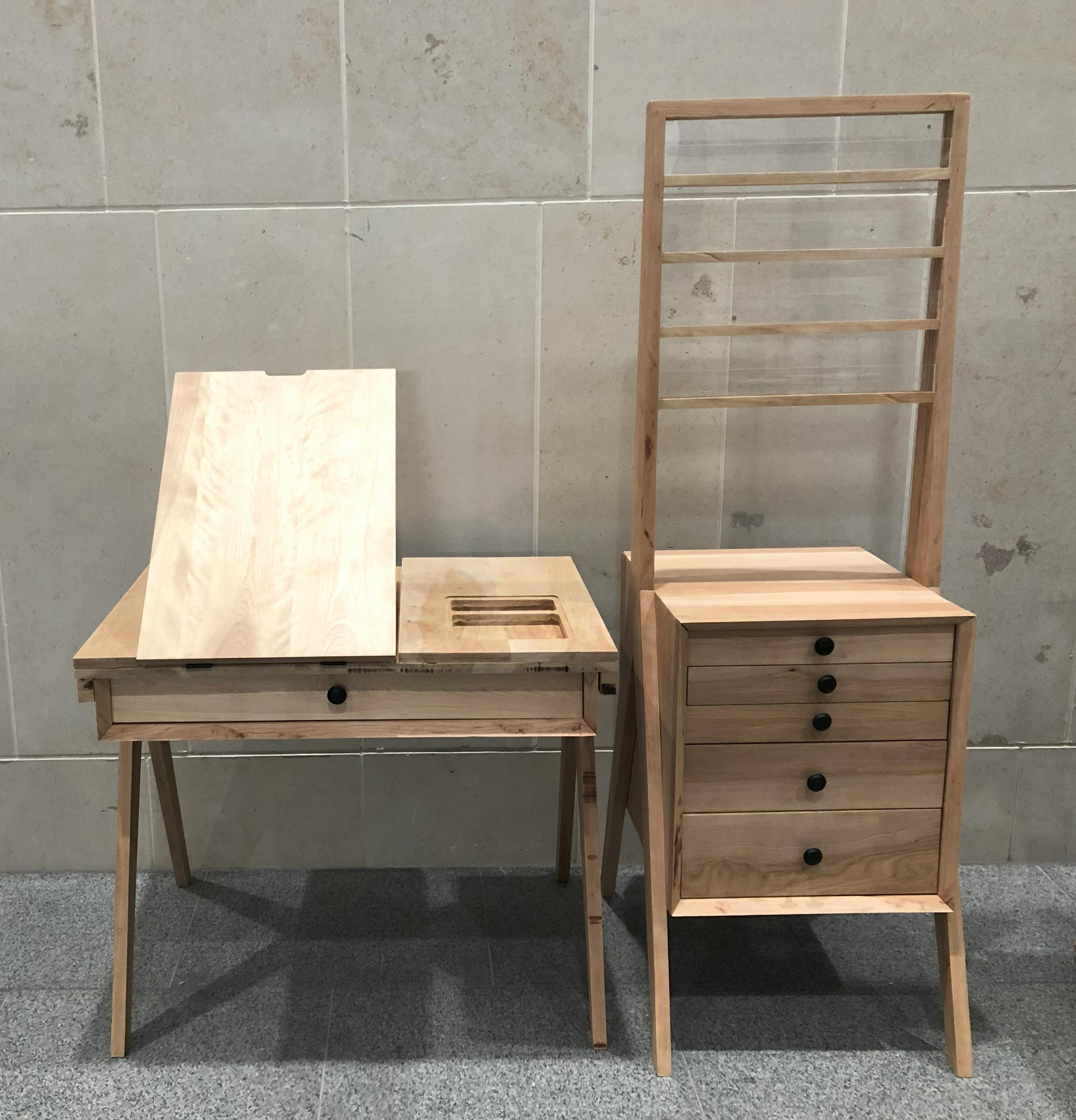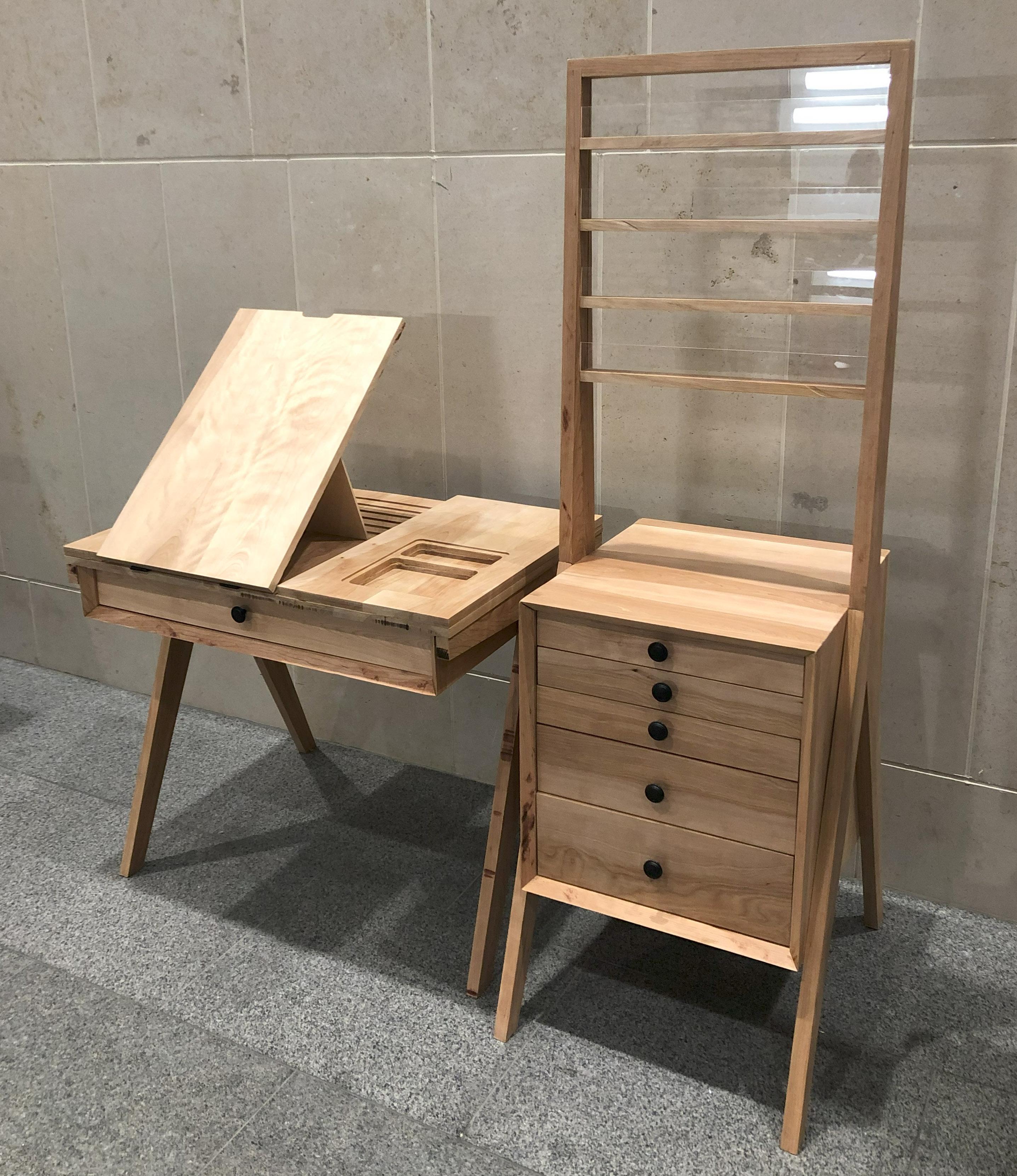 The process of this project included significant 3D modeling as well as CNC cutting in order to create more complex details. As the collection is completely made of wood, advanced joinery and connection systems were used to create seamless lines and unique angles. Custom drawer and easel elements were also designed to meet the function and storage needs of the project.