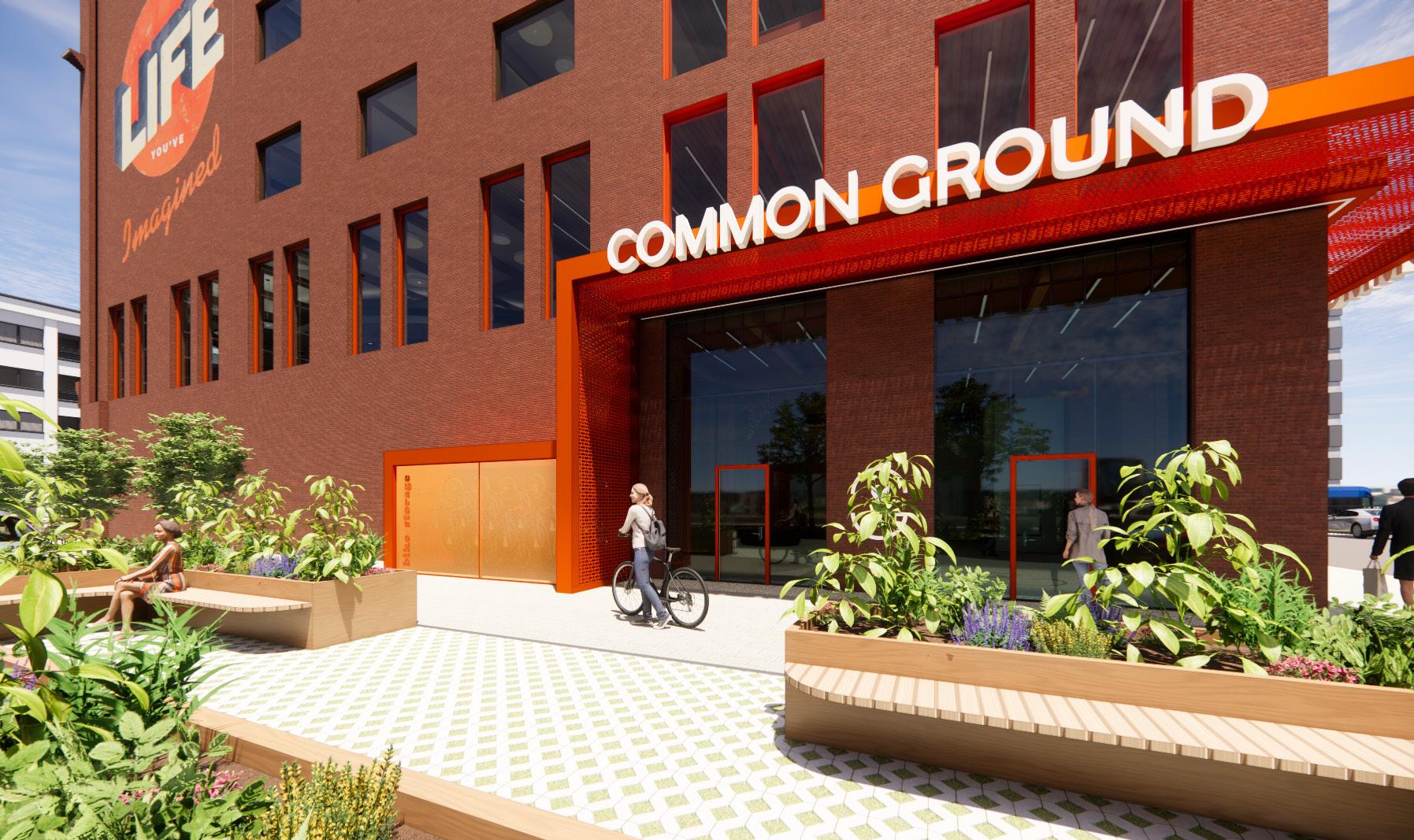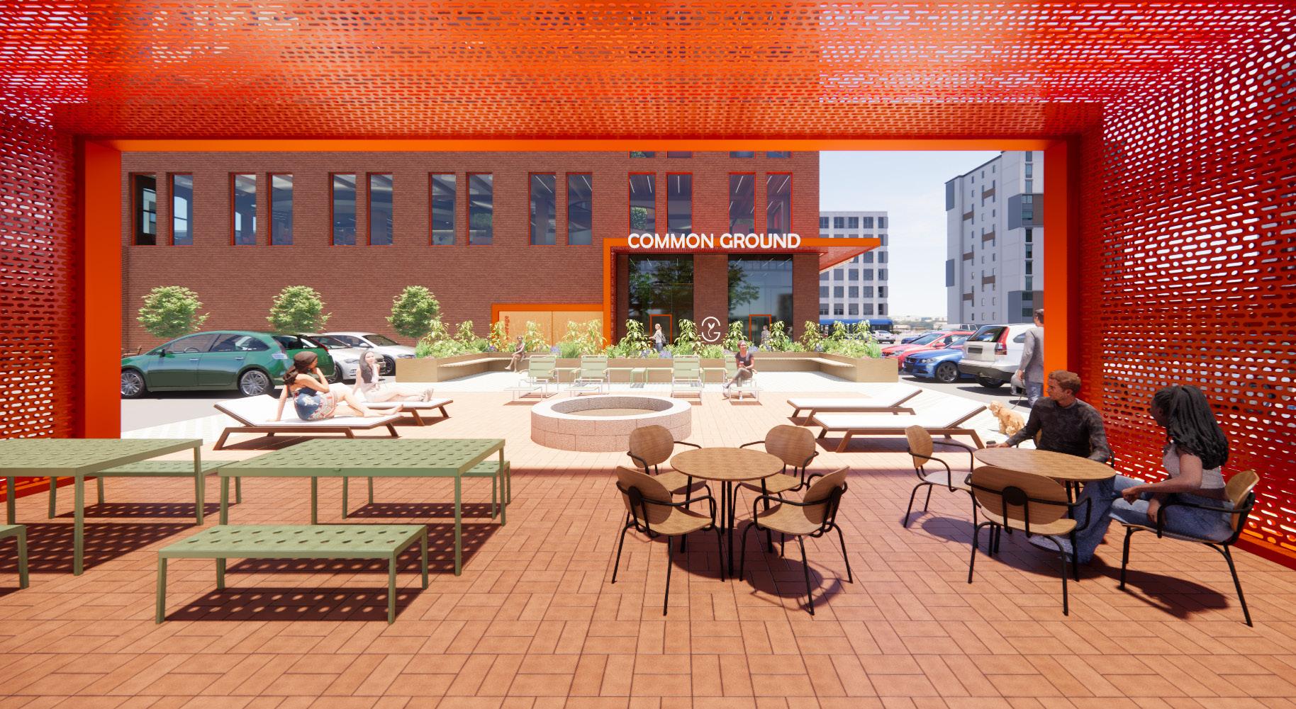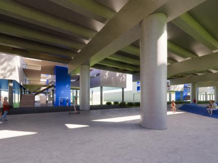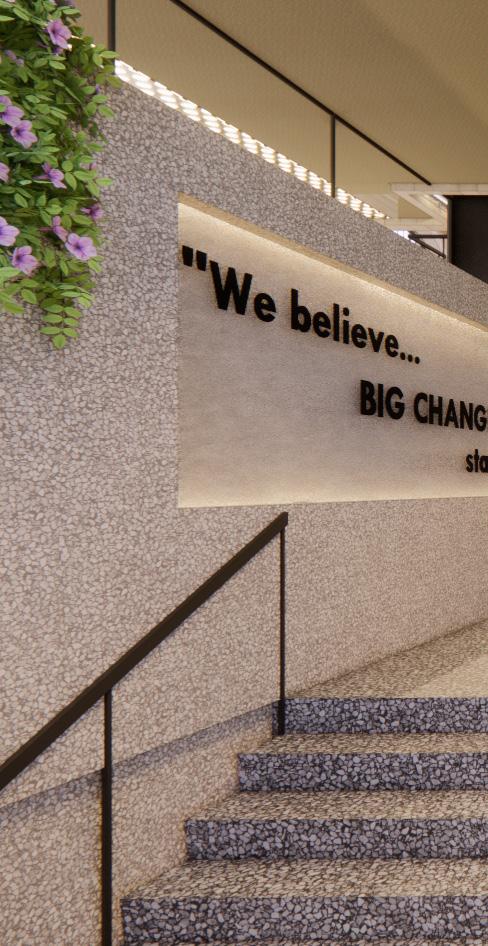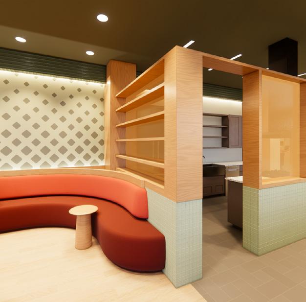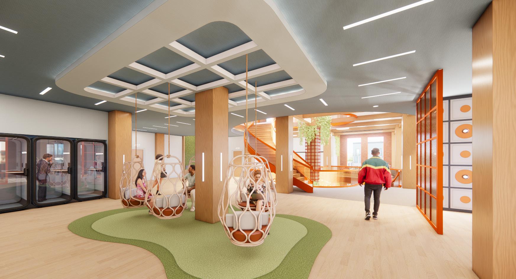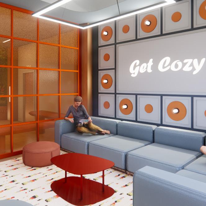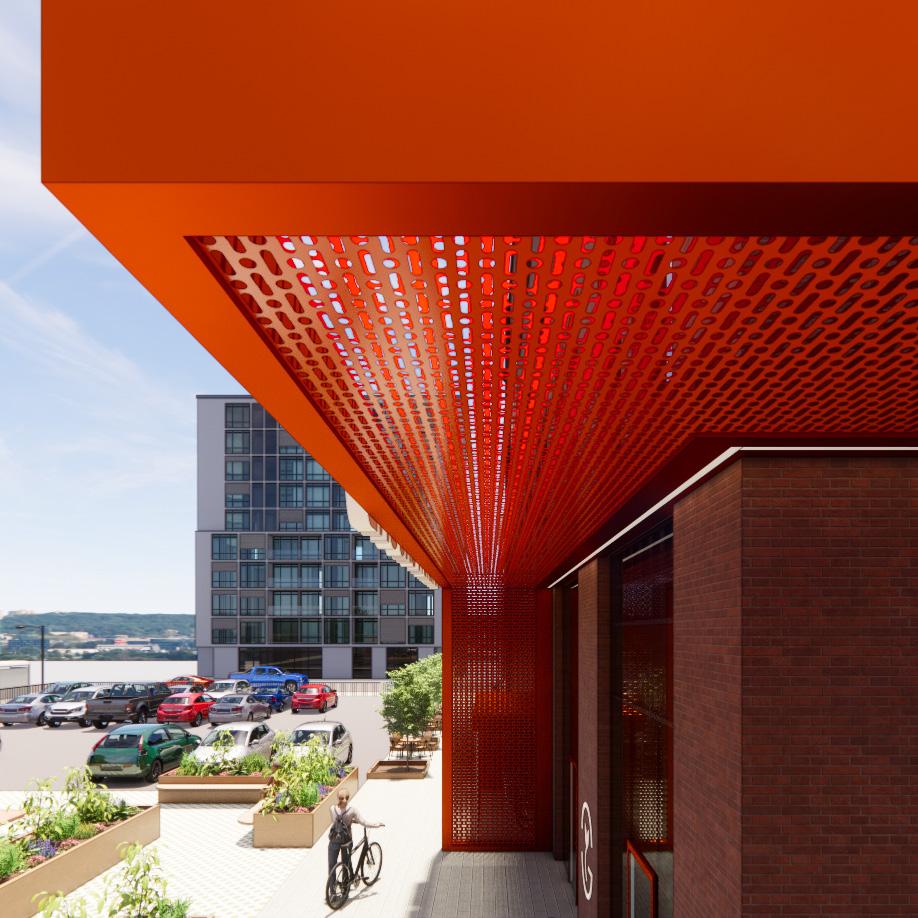 Taking the surrounding context into consideration, the existing site and facade has been redeveloped to draw in young adults by providing a series of easily accessible amenities. As users enter the site they are drawn towards and through energetic and colorful elements, transitioning from exterior to interior. These elements connect with interior spaces, allowing the building and site to be one.