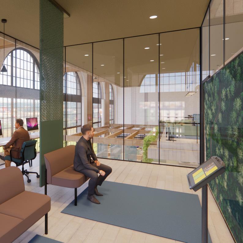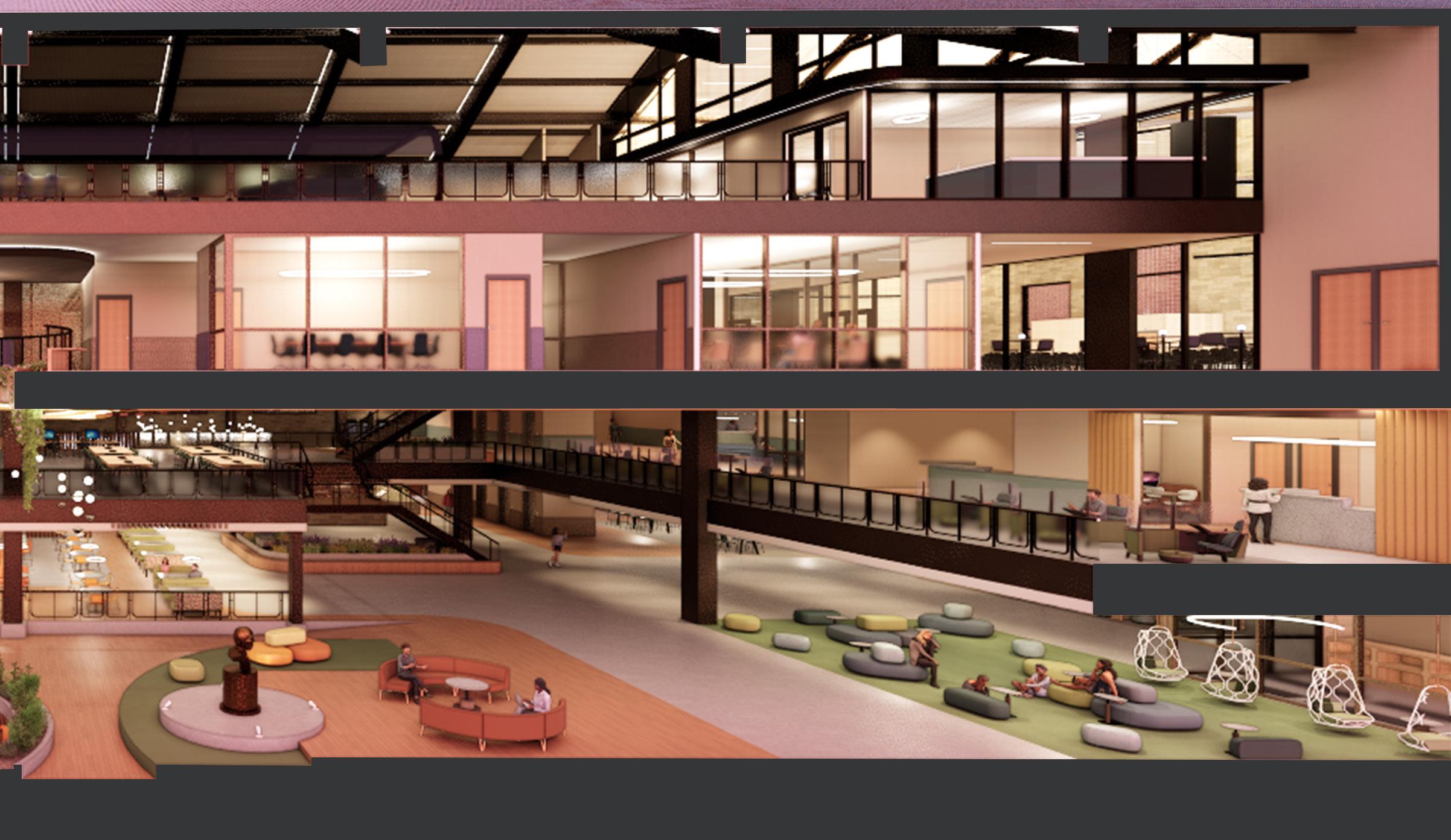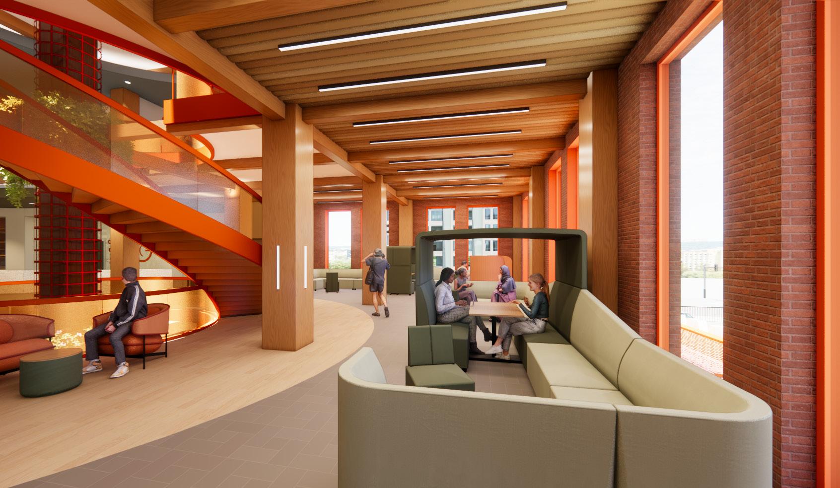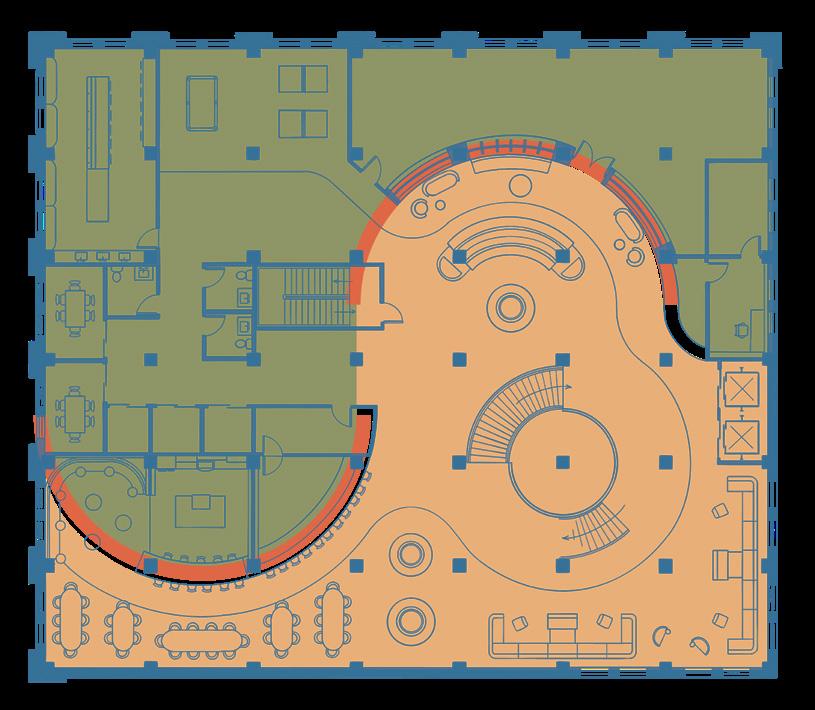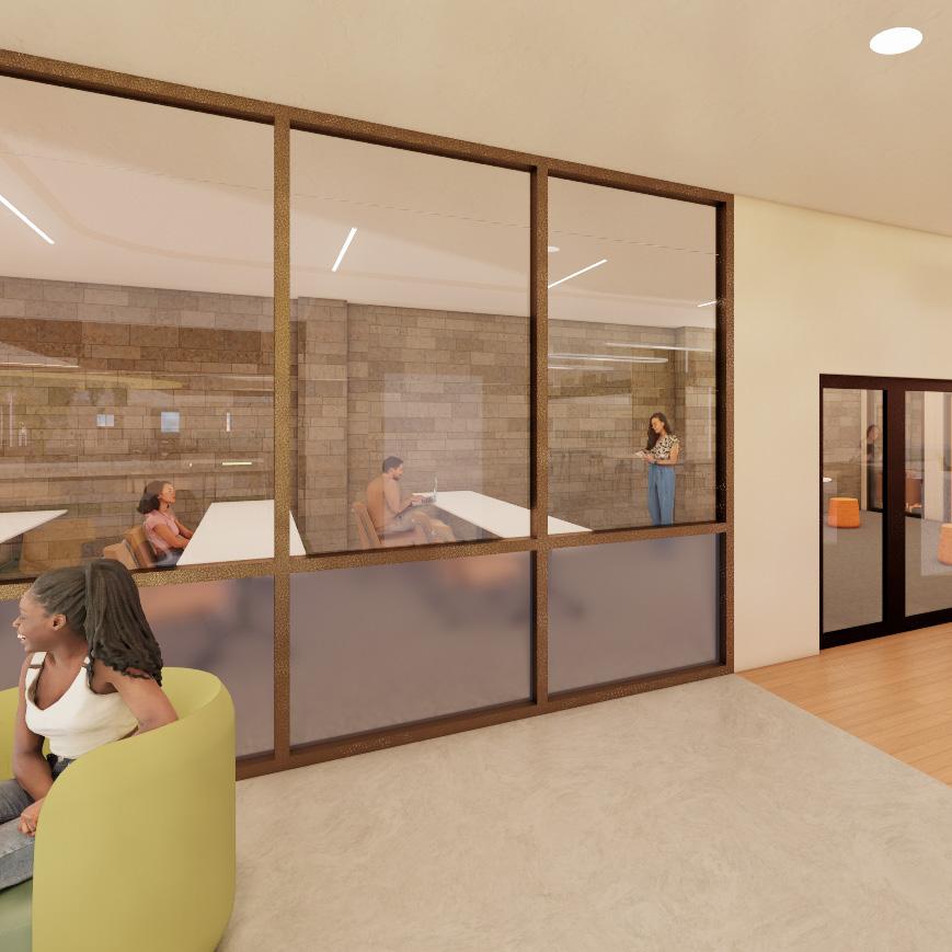The each floor of the building also integrates a range of additional amenities, such as yoga rooms, computers and printing, seating for alternative postures, as well as mental health, academic and financial services. Each level is also impacted by the “locus” below creating visual connections throughout the building and exposing the historic trusses which span throughout. The large event space on the thrid level highlights this structure as well as the grand cathedral-like glass block windows to the south.