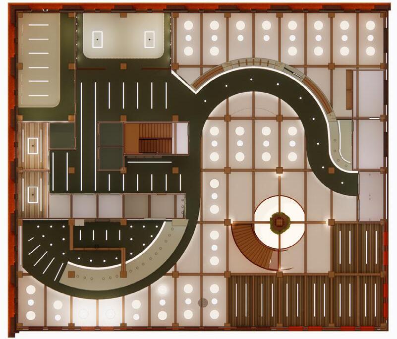Throughout each level the vertical structure is emphasized by pulling ceiling plane away while also accenting it through light reveals. On the third level this comes to a culmination in a three story suspended lighting fixture as well as large illuminated pockets in the overhead space.