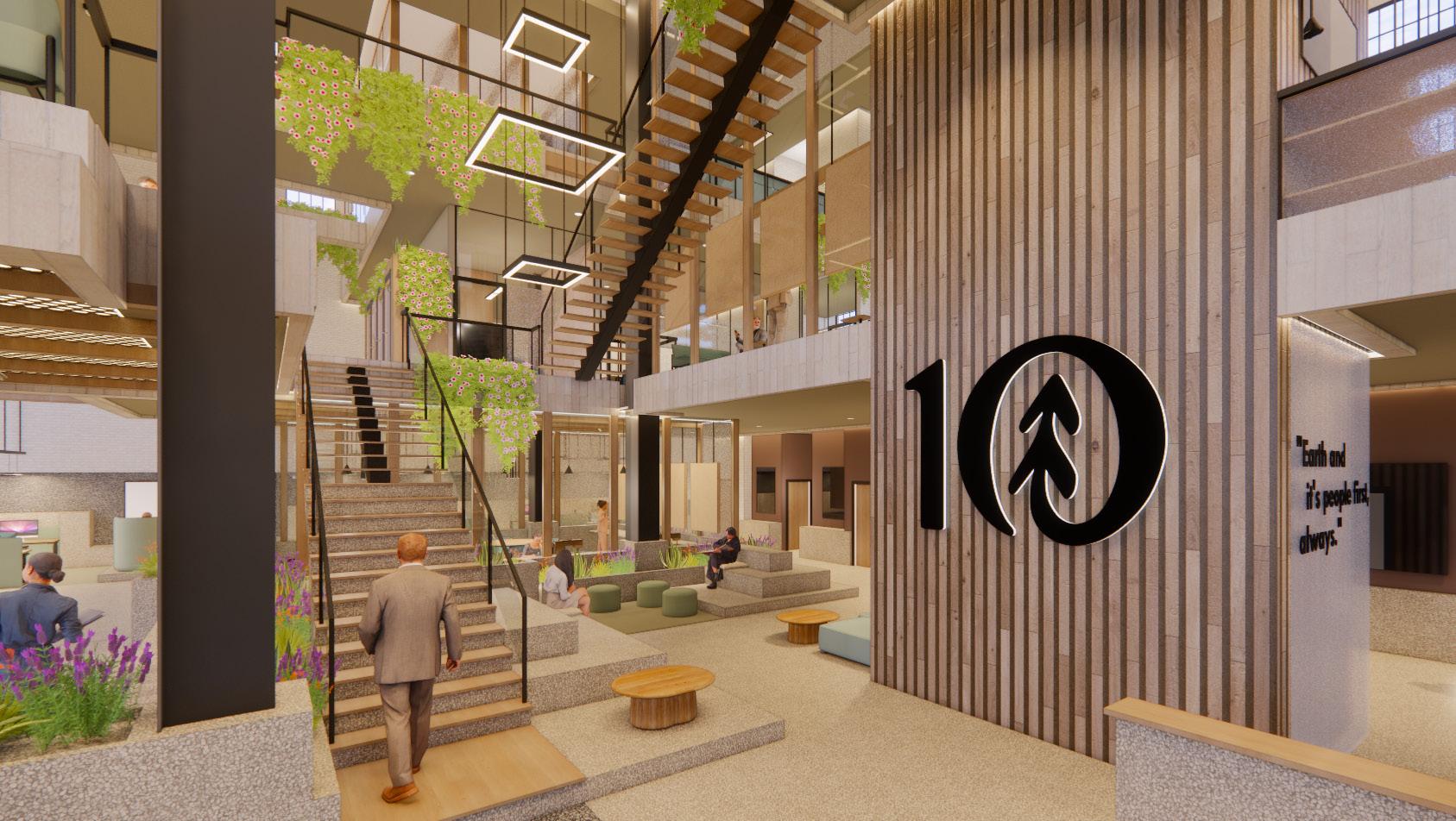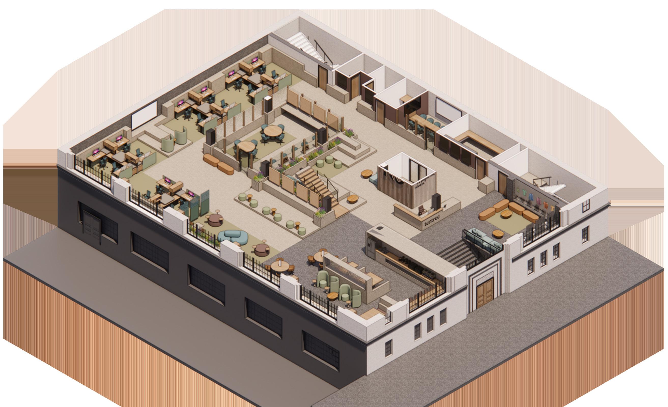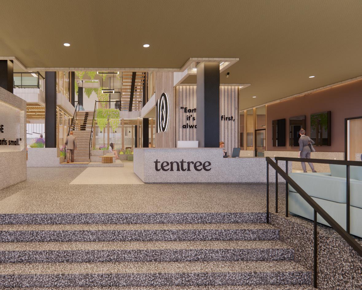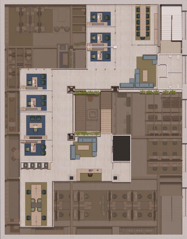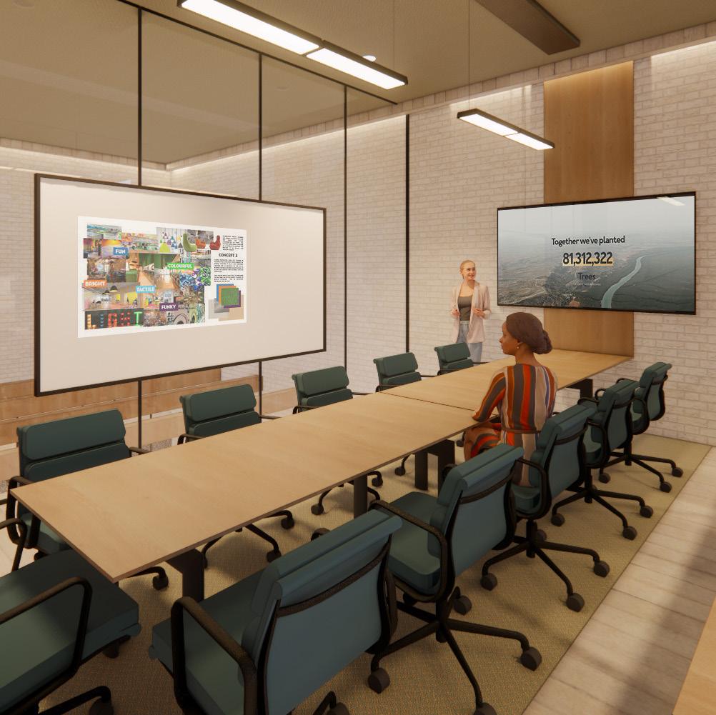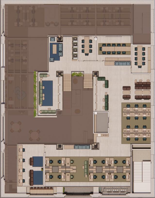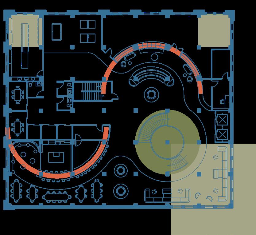 The second floor of TenTree’s headquarters is where a majority of workspaces reside. These workspaces vary in privacy as well as intended use whether that be open, collaborative spaces, or small conference spaces. In comparison to the massing and solidity of the ground level, the second floor is lighter, featuring stilted, suspended, and vertical elementsas well as furniture which is lifted and lighter in scale to reinforce the transition into the “branches” of the living building.