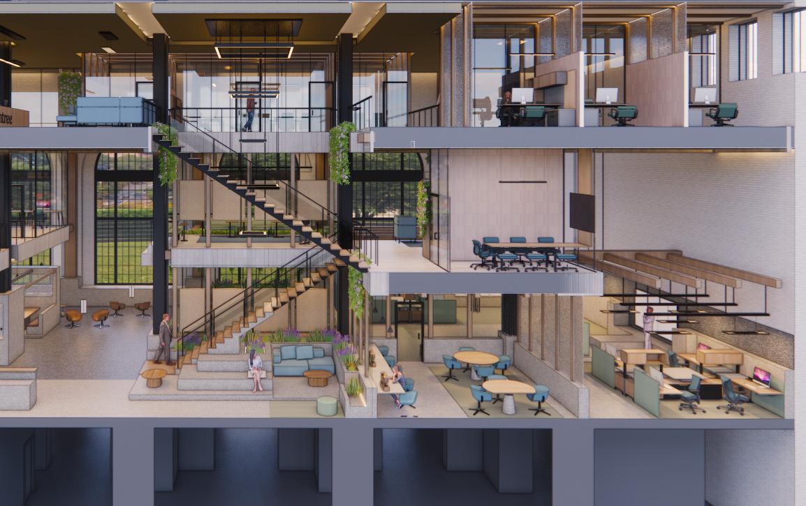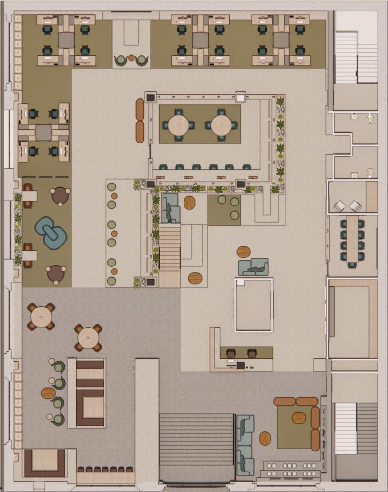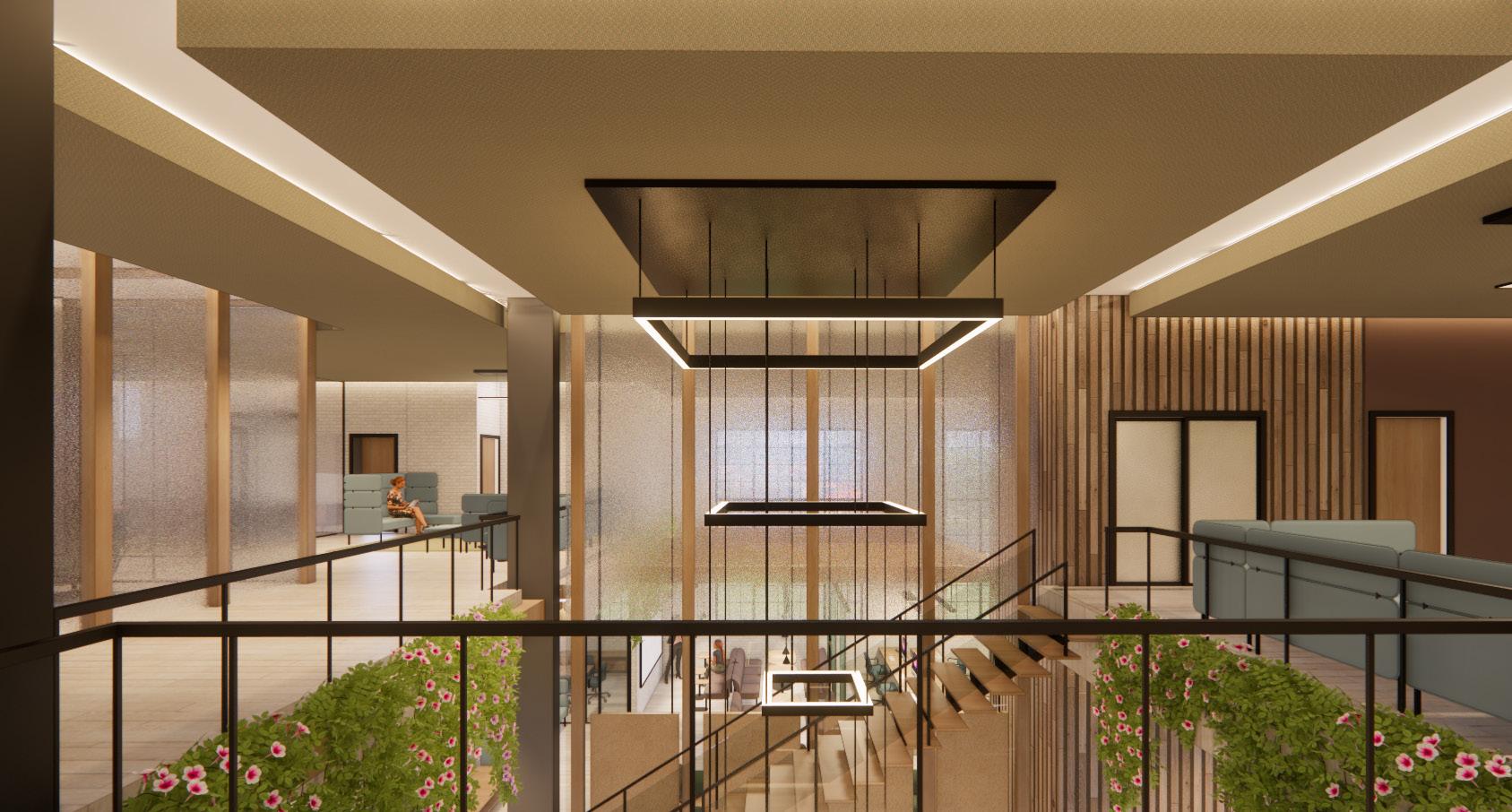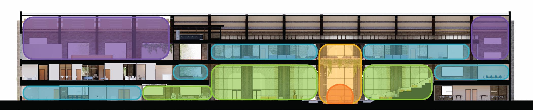 Entering the space where is is very solid and enclosed, then slowly releasing into an organic transitions through the space. The atrium becomes the central core which grounds, connects and supports all spaces adjacent. Moving vertically through the building it becomes quieter, more private as well as lightweight, creating a contrast to the liveliness below.