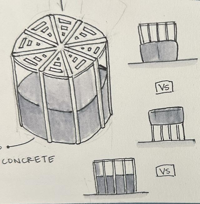 In order to design for this site, our group has created a system of 3 different pieces, allowing for each to be moved independently. At the end of the project we were able to produce two of each variation to fill the site and allow for users’ flexibility and choice.