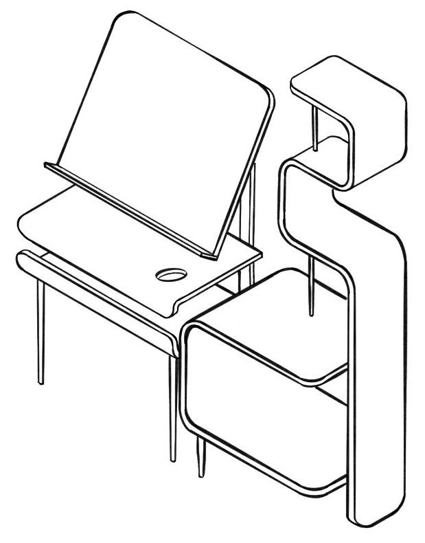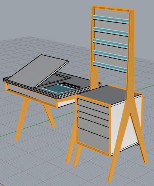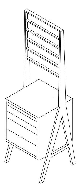 At the start of this project we were asked to identify a personal hobby or passion from which we could draw inspiration. I chose to develop this collection of pieces based on my love of painting, using the supplies and habits used to inform design decisions. The three goals needed to be fulfilled by the final design included: a workspace/surface, storage for supplies, and display for supplies and/or products of the activity. Conceptually, form and dimension meet the needs of tools and supplies, while also visually taking inspiration from their form as well.