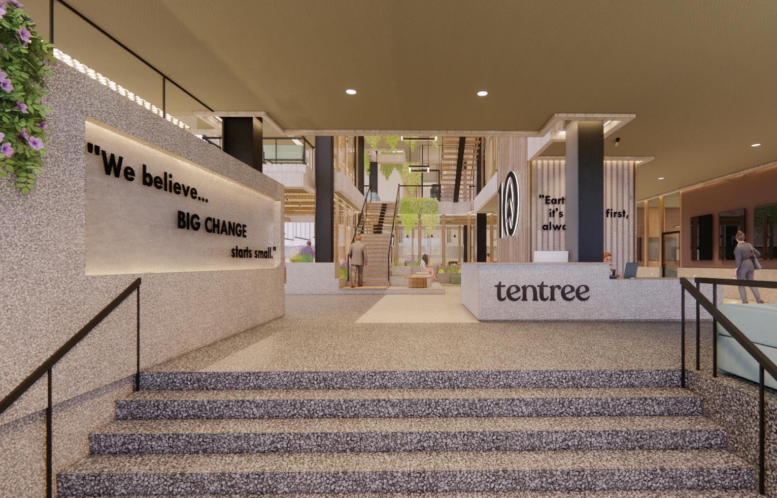 TenTree is and online apparel company which was founded with a focus and mission to create clothing which is comfortable, long-lasting and sustainably manufactured. They use eco-friendly materials, spread awareness about product care and environmental impacts, as well as partner with organizations across the globe to restore communities and natural habitats. In order to create an energetic and comfortable workplace enviroment, the design takes inspiration from the trees.