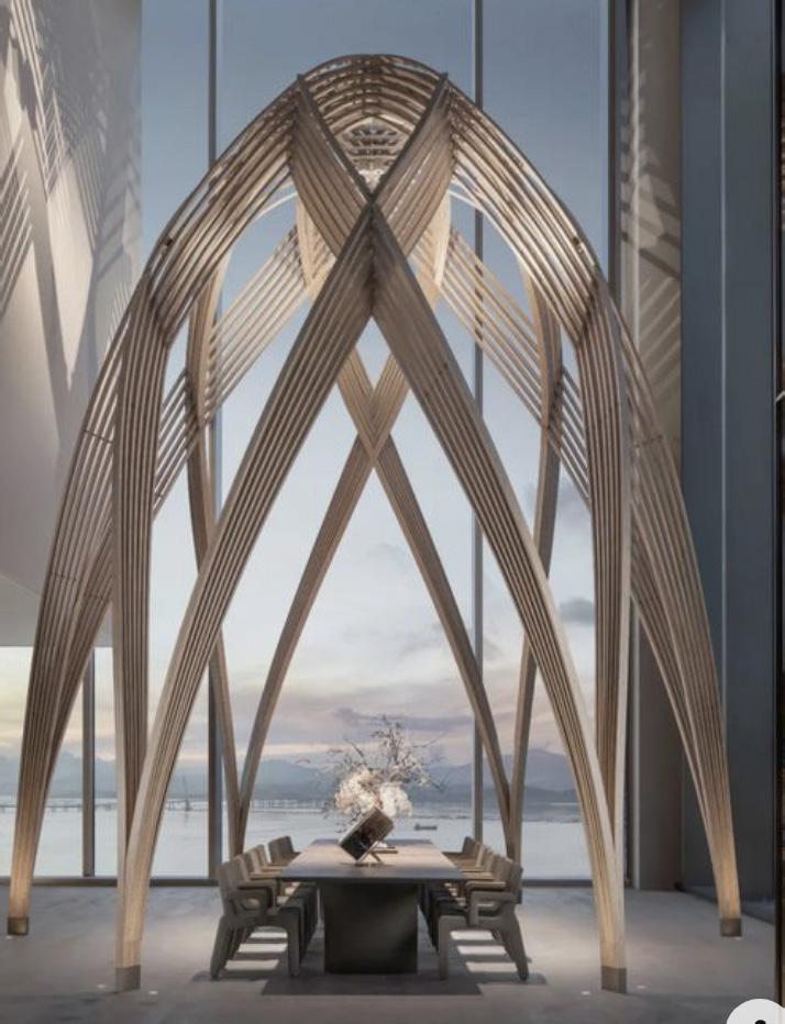 The architecture is made of arching members of timber wood and iron connections, proposedly provided by Shigeru Ban Architects, a company specializing in large-scale abstract timber wood architecture. Timber or Bamboo would work for this application because both are versatile and durable in outdoor conditions. However, timber would achieve the aesthetic goal of the golden-wooded texture.