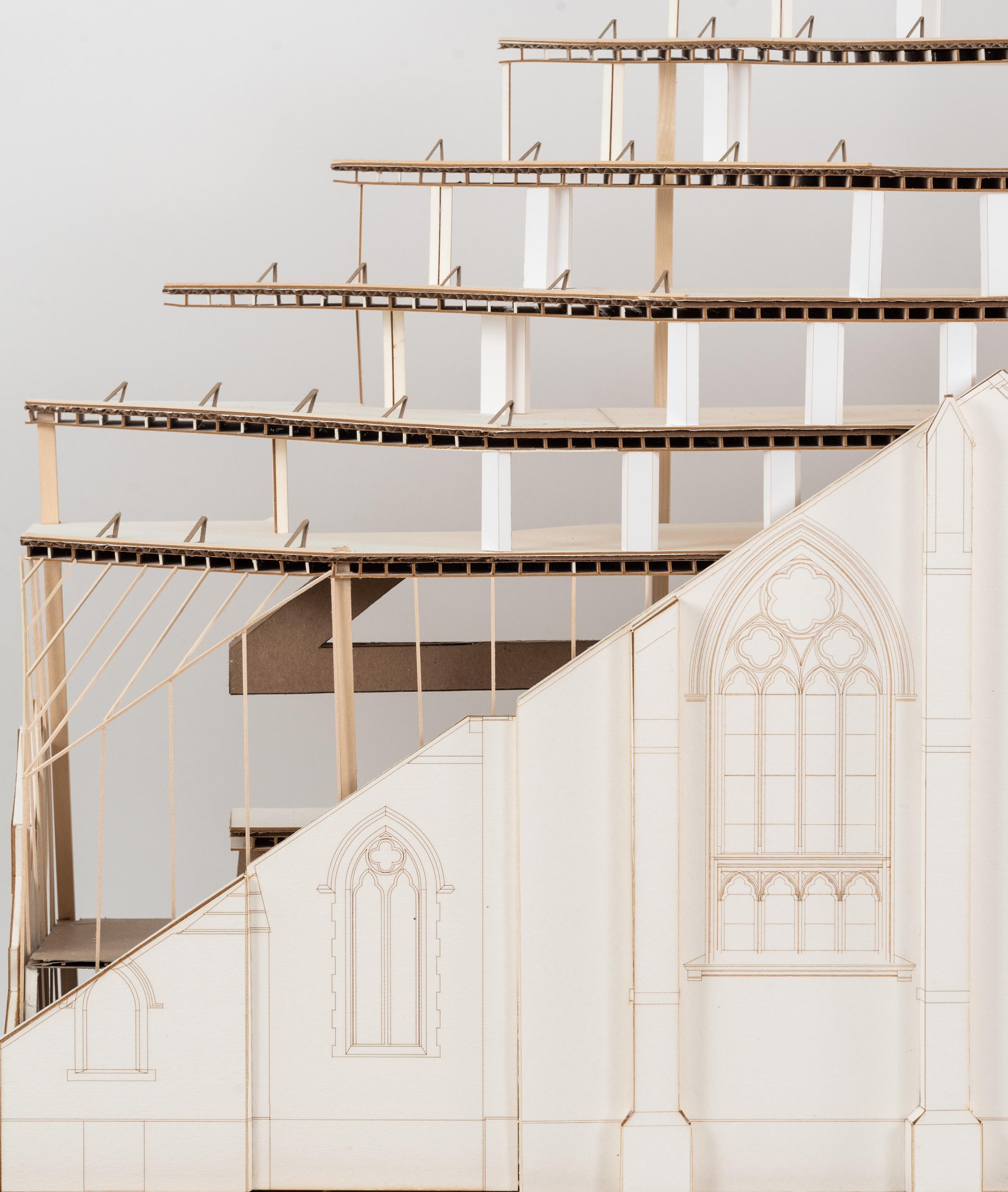 Social Repentance is an adaptive reuse project situated in the carcass of the decommissioned Saint Mary’s church in Troy, New York. Violently mutilated, the remains of Saint Mary’s church restrain the structure and serve as a critique of the city’s abandonment of its sanctuary yet also unveil the new renaissance of interaction at both the individual and communal scale. Social Repentance, a civic intersection, houses 30 individual residents and a social matrix; wrapped in concrete ramps that climb the walls of the in-between space, an open place where visitors can choose to retrace their steps. Away from where documentation is housed and living is privatized, this physical structure serves as nodes that revitalize the public experience rather than eradicating it. By encouraging civic exchange through flexible design, accessibility, and transparency, our society’s perception of the city’s public spaces can change creating a social cohesion.