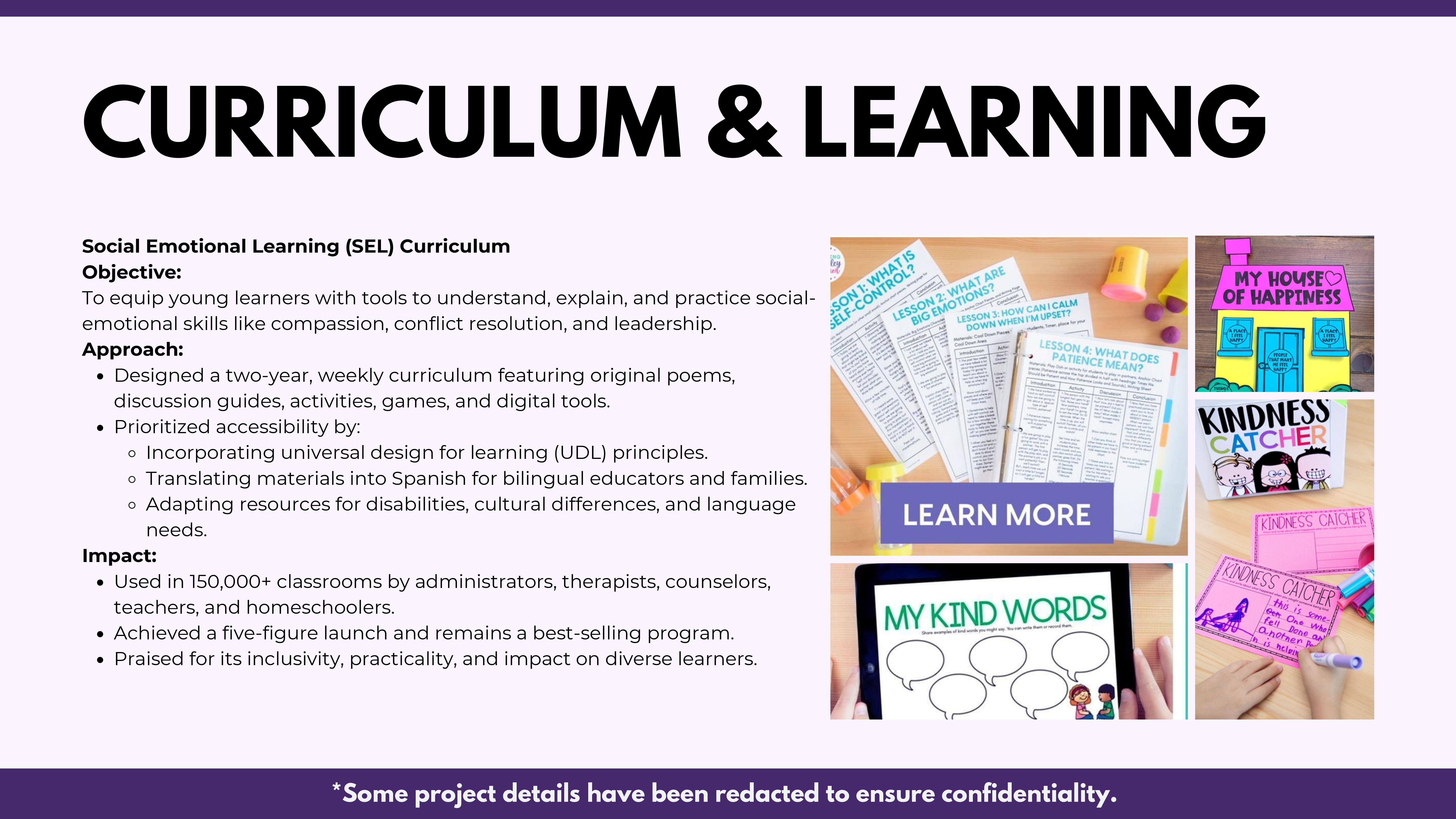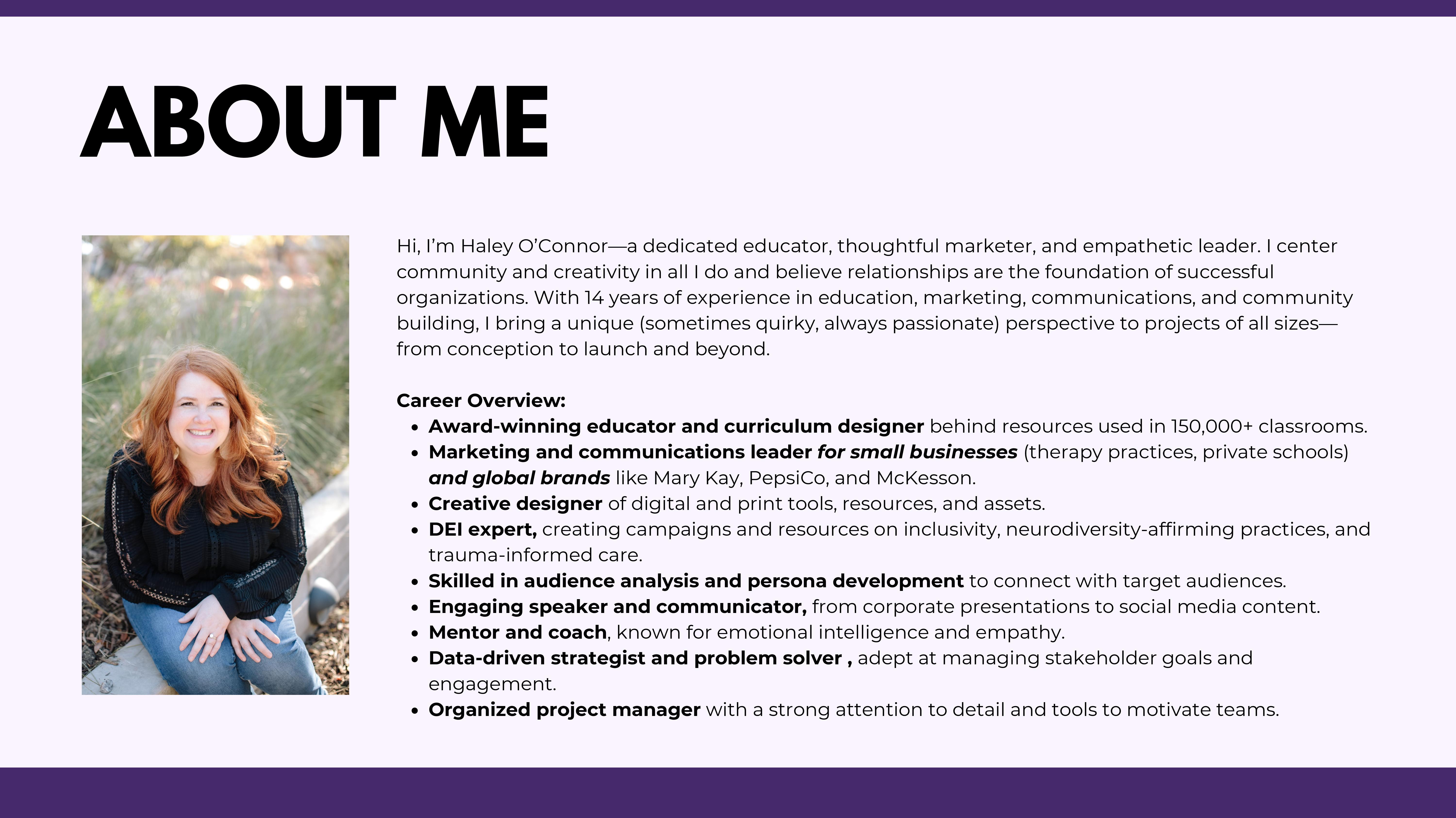 Dedicated educator, thoughtful marketer, and empathetic leader with 14+ years of experience blending creativity, strategy, and data-driven insights to drive meaningful results. From designing curriculum for 150,000+ classrooms to leading marketing campaigns for global brands, I specialize in creating inclusive, impactful experiences that connect, educate, and inspire.