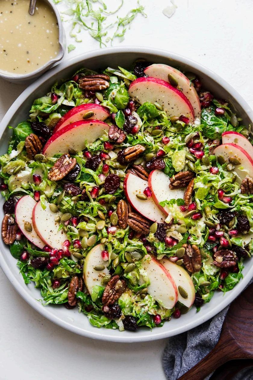 In a large bowl, toss the shaved Brussels sprouts with the pepitas, pecans, apple slices, cherries, pomegranate seeds, and dressing until coated.