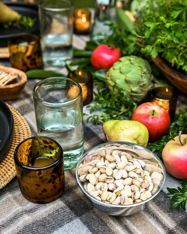 For a large cocktail party, we suggest a self-serve bar. Stock it with the standard necessities - a bourbon, a vodka, a gin and a tequila; tonic and soda; lemons and limes. Don’t forget your ice (and serve in our Starry Night ice bucket). We always have a cooler of beer (for an elevated cooler look, serve in our rattan champagne bucket) and several wine options (pinot noir, cab, sauvignon blanc and chardonnay). We also love to serve a ‘signature cocktail’ at parties like this. Something that is seasonal and festive. This year we’ll be serving a Peppermint White Russian in our clear Cabana rocks glasses. The Cabana stripes and the candy cane rim will make for the perfect festive signature drink.