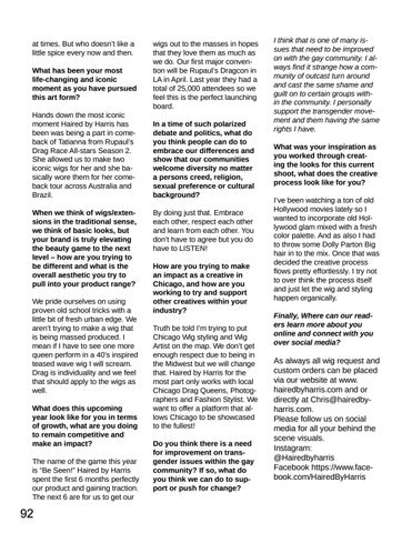 wigs out to the masses in hopes that they love them as much as we do. Our first major convention will be Rupaul’s Dragcon in LA in April. Last year they had a total of 25,000 attendees so we feel this is the perfect launching board. In a time of such polarized debate and politics, what do you think people can do to embrace our differences and show that our communities welcome diversity no matter a persons creed, religion, sexual preference or cultural background? By doing just that. Embrace each other, respect each other and learn from each other. You don’t have to agree but you do have to LISTEN! How are you trying to make an impact as a creative in Chicago, and how are you working to try and support other creatives within your industry? Truth be told I’m trying to put Chicago Wig styling and Wig Artist on the map. We don’t get enough respect due to being in the Midwest but we will change that. Haired by Harris for the most part only works with local Chicago Drag Queens, Photographers and Fashion Stylist. We want to offer a platform that allows Chicago to be showcased to the fullest! Do you think there is a need for improvement on transgender issues within the gay community? If so, what do you think we can do to support or push for change?