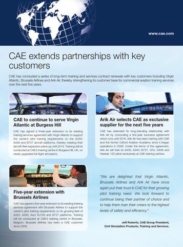 CAE extends partnerships with key customers CAE has concluded a series of long-term training and services contract renewals with key customers including Virgin Atlantic, Brussels Airlines and Arik Air, thereby strengthening its customer base for commercial aviation training services over the next five years.