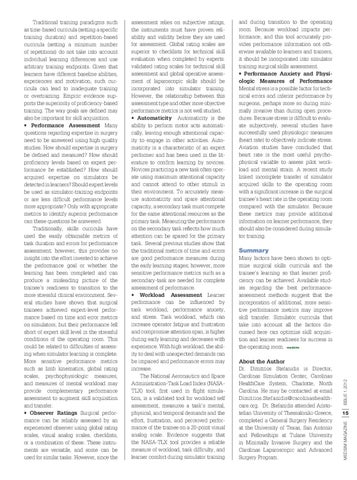 and during transition to the operating room. Because workload impacts performance, and this tool accurately provides performance information not otherwise available to learners and trainers, it should be incorporated into simulator training surgical skills assessment. • Performance Anxiety and Physiologic Measures of Performance Mental stress is a possible factor for technical errors and inferior performance by surgeons, perhaps more so during minimally invasive than during open procedures. Because stress is difficult to evaluate subjectively, several studies have successfully used physiologic measures (heart rate) to objectively indicate stress. Aviation studies have concluded that heart rate is the most useful psychophysical variable to assess pilot workload and mental strain. A recent study linked incomplete transfer of simulator acquired skills to the operating room with a significant increase in the surgical trainee’s heart rate in the operating room compared with the simulator. Because these metrics may provide additional information on learner performance, they should also be considered during simulator training.