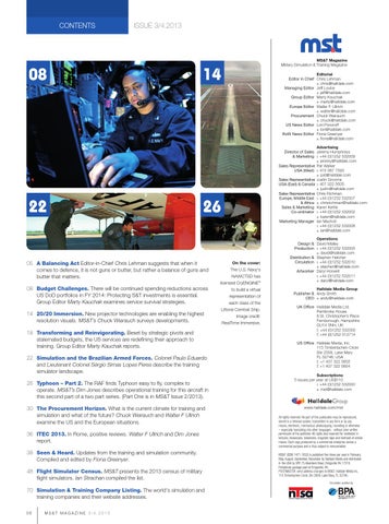 05 A Balancing Act Editor-in-Chief Chris Lehman suggests that when it comes to defence, it is not guns or butter, but rather a balance of guns and butter that matters. 08 Budget Challenges. There will be continued spending reductions across US DoD portfolios in FY 2014: Protecting S&T investments is essential. Group Editor Marty Kauchak examines service survival strategies. 14 20/20 Immersion. New projector technologies are enabling the highest resolution visuals. MS&T’s Chuck Wierauch surveys developments. 18 Transforming and Reinvigorating. Beset by strategic pivots and stalemated budgets, the US services are redefining their approach to training. Group Editor Marty Kauchak reports. 22 Simulation and the Brazilian Armed Forces. Colonel Paulo Eduardo and Lieutenant Colonel Sérgio Simas Lopes Peres describe the training simulator landscape. 26 Typhoon – Part 2. The RAF finds Typhoon easy to fly, complex to operate. MS&T’s Dim Jones describes operational training for this aircraft in this second part of a two part series. (Part One is in MS&T Issue 2/2013). 30 The Procurement Horizon. What is the current climate for training and simulation and what of the future? Chuck Weirauch and Walter F Ullrich examine the US and the European situations. 36 ITEC 2013. In Rome, positive reviews. Walter F Ullrich and Dim Jones report. 38 Seen & Heard. Updates from the training and simulation community. Compiled and edited by Fiona Greenyer. 48 Flight Simulator Census. MS&T presents the 2013 census of military flight simulators. Ian Strachan compiled the list.