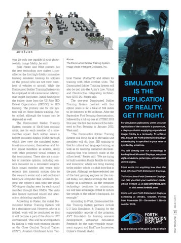 was the only one capable of such photorealistic image fidelity, he said. Both Foster and West pointed out the new technology now makes it possible for the first high-fidelity immersive training simulator training for soldiers on the ground who are not crew members of vehicles or aircraft. While the Dismounted Soldier Training System can be employed for all scenarios an infantryman might encounter, initial funding for the trainer came from the US Joint IED Defeat Organization (JIEDDO) for IED training. The primary use for the system will be Home Station training, Foster added, although the trainer can be deployed as well. The Dismounted Soldier Training System consists of 10x10-foot modular units, one for each member of a ninemember squad. Each soldier wears a helmet-mounted display (HMD) through which they view the simulated operational environment, themselves and fellow squad members as avatars, along with other projected virtual entities in the environment. There also are a number of interface options, including sensors mounted on a simulated weapon. Each squad member also wears body sensors that transmit motion data to the wearer's avatar and a self-contained backpack computer that wirelessly projects the wearer's data onto the visual 360-degree display seen by each squad member through their HMDs. The units also feature surround sound and afteraction debriefing capabilities. According to Foster, the initial Dismounted Soldier Training System will be a standalone unit. However, after it is fielded, work will be conducted so that it will become a part of the Army's LVC environment. This will be accomplished by linking it with such existing trainers as the Close Combat Tactical Trainer (CCTT), Aviation Combined Arms Tac-
