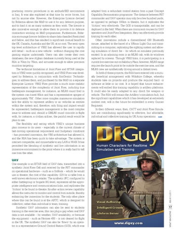 practising convoy procedures in an ambush/IED environment in Iraq. It was also exploited at that time by recce forces, but not by anyone else. However, the Enterprise Licence devised by Bohemia allows the MoD to use it for any defence purpose, and to load it on as many systems as they wish. The licence is also innovative enough to allow them to provide it to defence contractors working on MoD programmes. Furthermore, Bohemia encourage licence-holders to share data classified Restricted and below, and this has resulted in significant mutual benefit to the UK, Canada, Australia and the US, at no cost. The semi-open top-level architecture of VBS2 has allowed the user to rapidly add detail – such as a new vehicle - without changing the core gaming engine underneath. Users can also create their own databases; the new Afghan database currently being used at the RSA is 70km by 70km, and accurate enough to allow precision munition targeting. The technical limitations of Joint Fires and ISTAR integration in VBS2 were quickly recognised, and VBS2 Fires was developed by Bohemia, in conjunction with SimCentric Technologies, to address them, and purchased by the MoD on a separate Enterprise Licence. VBS2 Fires provides a much more realistic representation of the complexity of Joint Fires, including true battlespace management; for instance, an MLRS round fired in the system can travel 80km and has a representative apogee of approximately 75K’. Other more complex manoeuvre simulators lack the ability to represent artillery or air vehicles as entities within the system and, therefore, only firing and impact would be represented; battlespace management is the most complex issue to address and, should a GMLRS round coincide in flight with, for instance, a civilian airliner, the painful result would be plain to see. The flexibility and saving which VBS2’s unique business plan conveys to its users – especially in the current climate of fast-moving operational requirement and budgetary constraint – has promoted innovation, the VBS architecture has allowed it, and the RSA has been quick to take advantage. The system is internet-compatible, and connectable to any LAN or WAN. It has permitted the blending of synthetic and live information in an immersive environment to the point where it is really hard to tell one from the other.
