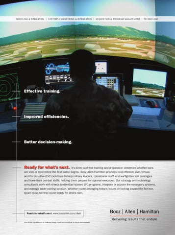 Ready for what’s next. It’s been said that training and preparation determine whether wars are won or lost before the first battle begins. Booz Allen Hamilton provides cost-effective Live, Virtual, and Constructive (LVC) solutions to help military leaders, operational staff, and warfighters test strategies and hone their combat skills, helping them prepare for optimal execution. Our strategy and technology consultants work with clients to develop focused LVC programs, integrate or acquire the necessary systems, and manage each training session. Whether you’re managing today’s issues or looking beyond the horizon, count on us to help you be ready for what’s next.