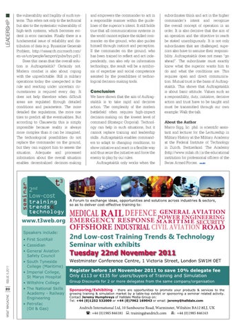 subordinates think and act in the higher commander’s intent and recognize the overall concept of operation in an order. It is also decisive that the aim of an operation and the objective to reach be stated unambiguously. It is not only subordinates that are challenged; superiors also have to assume their responsibility. Auftragstaktik does not mean “go ahead”. The subordinate must exactly know what the superior wants him to do and what the conditions are. This requires open and direct communication. Mutual trust is the basis of Auftragstaktik. This shows that Auftragstaktik is about basic attitude. Values such as a responsibility, duty, initiative, decisive action and trust have to be taught and must be transmitted through our own example: Walk the talk. About the Author Marco Sigg, lic. phil. is scientific assistant and lecturer for the Lectureship in Military History at the Military Academy at the Federal Institute of Technology in Zurich. Switzerland. The Academy (http://www.milak.ch ) is the educational institution for professional officers of the Swiss Armed Forces. ms&t