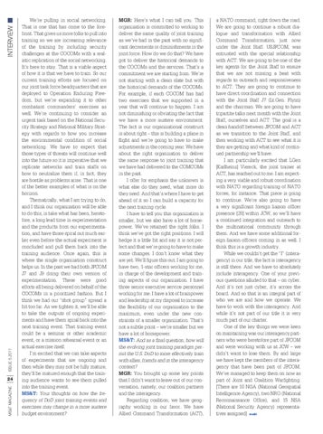 a NATO command, right down the road. We are going to continue a robust dialogue and transformation with Allied Command Transformation, just now under the Joint Staff. USJFCOM, was entrusted with the special relationship with ACT. We are going to be one of the key agents for the Joint Staff to ensure that we are not missing a beat with regards to outreach and responsiveness to ACT. They are going to continue to have direct coordination and connection with the Joint Staff J7 (Lt.Gen. Flynn) and the chairman. We are going to have tripartite talks next month with the Joint Staff, ourselves and ACT. The goal is a clean handoff between JFCOM and ACT as we transition to the Joint Staff, and then working with ACT to see what it is they are getting and what kind of continued partnership we’ll have. I am particularly excited that LGen [Karlheinz] Viereck, the joint trainer at ACT, has reached out to me. I am expecting a very viable and robust coordination with NATO regarding training of NATO forces, for instance. That piece is going to continue. We’re also going to have a very significant foreign liaison officer presence [28] within JCW, so we’ll have a continued integration and outreach to the multinational community through them. And we have some additional foreign liaison officers coming in as well. I think this is a growth industry. While we couldn’t get the “I” (interagency) in our title, the fact is interagency is still there. And we have to absolutely include interagency. One of your previous questions alluded to that – on cyber. And it’s not just cyber, it’s across the board. And so that is an integral part of who we are and how we operate. We have to work with the interagency. And while it’s not part of our title it is very much part of our charter. One of the key things we were keen on maintaining was our interagency partners who were heretofore part of JFCOM and were working with us at JCW – we didn’t want to lose them. By and large we have kept the members of the interagency that have been part of JFCOM. We’ve managed to keep them on now as part of Joint and Coalition Warfighting. [There are 10 NGA (National Geospatial Intelligence Agency), two NRO (National Reconnaissance Office), and 15 NSA (National Security Agency) representatives assigned] ms&t