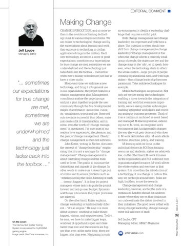 an environment is clearly a leadership challenge that requires a skilful pilot. Both change management and change leadership are important and both have a place. The question is when should one shift from change management to change leadership? Change management is fine when the change affects a relatively small group of people, the stakes are low and the change stays in the ‘silo’, so to speak; however, when the technology starts to affect the whole system – large groups of people, crossing organisational silos, and with high stakes – then change leadership becomes paramount. Take mobile technologies for example. Mobile technologies are pervasive. Not only are we are seeing the technologies enabling a move towards the integration of training and work but even more importantly, we are seeing mobile technologies enabling integrated workplaces and rewriting analogue business processes. Think of it as a continuum anchored in event based and managed M-learning lessons, extending out to M-work, an integrated work environment that fundamentally changes the way the work gets done and who does it. M-work demolishes silos. M-work affects doctrine, structure, policy, and training. M-learning with its focus on the individual derives its ROI from training resources and students, stakes are relatively low; on the other hand, M-work focusses on the organisation and ROI is derived from organisational performance. M-work affects the whole system and everyone in that system. It is more than the introduction of a technology; it is a change in culture (the way we do things around here). Risks are high, but then, so are the rewards. Change management and change leadership, likewise, anchor the ends of a continuum. Leaders should not underestimate where they are on that continuum nor underestimate the stakes involved in their initiatives. The good news is that with strong change leadership, change management will take care of itself.