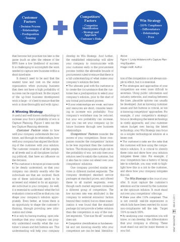 develop its Win Strategy. And further, the established relationship will allow your company to communicate with your customer early in the procurement process (within the allowable bounds of procurement rules) to ensure that there is a full understanding of what makes your company’s solution the best. • The ultimate goal with the customer is to create the circumstance that the customer has a predisposition to select your company’s solution, prior to the start of any formal procurement process. • If your relationships are weak, and time and resources are short, consider teaming to increase win probability. Your company’s workshare may be reduced, but your win probability can increase, and you can set your company up for future business through new business relationships. Competitors’ Factors consider the moves of your competition. Some companies consider the competitors’ factors to be less important than the customer factors. This thinking poses a high risk to the probability of win: not only does your solution need to satisfy the customer, but it also has to come out ahead over your competitors’ solutions. One company provided similar services in different market segments. The company developed standard service packages at standard prices, and offered these to all market segments, even though each market segment contained a different group of competitors. The low success rate was attributed in the company to external economic factors beyond their control, but on closer examination it was found that the standard package did not provide a better solution than the competition in any of the market segments. “One size fits all” normally does not. • Competitor identification is fundamental and not knowing exactly who your competitors are can be fatal. Identifica-