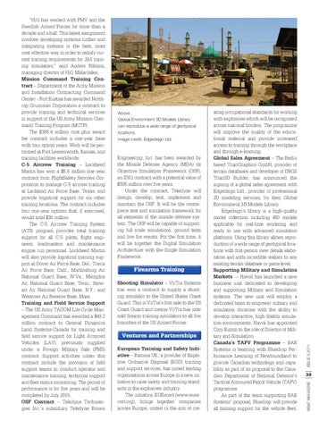 ating occupational standards for working with explosives which will be recognised across national borders. The programme will improve the quality of the educational material and provide increased access to training through the workplace and through e-learning. Global Sales Agreement – The Berlin based TrianGraphics GmbH, provider of terrain databases and developer of DBGS Trian3D Builder, has announced the signing of a global sales agreement with Edgedsign Ltd., provider of professional 3D modeling services, for their Global Environment 3D Models Library. Edgedsign’s library is a high-quality model collection including 450 models applicable for real-time rendering and ready to use with advanced simulation platforms. Using this library allows reproduction of a wide range of geotypical locations with first-person view details elaboration and adds incredible realism to any existing terrain database or game level. Supporting Military and Simulation Markets -– Havok has launched a new business unit dedicated to developing and supporting Military and Simulation systems. The new unit will employ a dedicated team to empower military and simulation divisions with the ability to develop interactive, high-fidelity simulation environments. Havok has appointed Cory Kumm to the role of Director of Military and Simulation. Canada’s TAPV Programme – BAE Systems is teaming with Bluedrop Performance Learning of Newfoundland to provide Canadian technology and capability as part of its proposal to the Canadian Department of National Defence’s Tactical Armoured Patrol Vehicle (TAPV) programme. As part of the team supporting BAE Systems’ proposal, Bluedrop will provide all training support for the vehicle fleet.