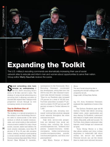 Expanding the Toolkit The U.S. military’s recruiting commands are dramatically increasing their use of social network sites to educate and inform men and women about opportunities to serve their nation. Group editor Marty Kauchak reviews the scene.