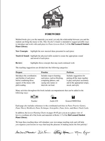 Each page also includes references to the coordinated activities in Piano Practice Games, Piano Theory Workbook, Piano Technique, Notespeller, Piano Solos, and Music Flash Cards. In addition, the Lesson Planning Charts on pages 49-65 give you an at-a-glance view of how to coordinate all of the books and materials in Books 1-5 of the Hal Leonard Student Piano Library. We hope these teaching ideas will stimulate your own unique teaching style and will help you organize your lessons in ways that keep the pleasure of making music the first priority!