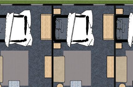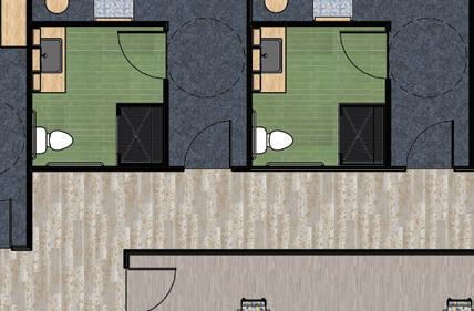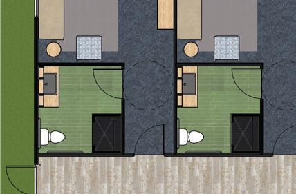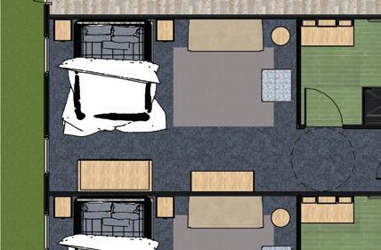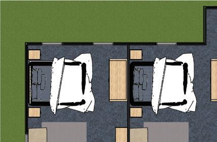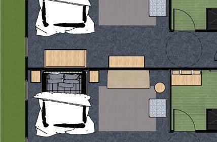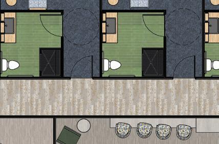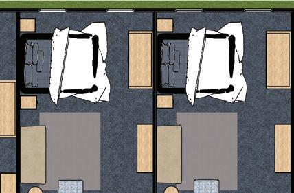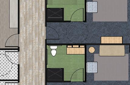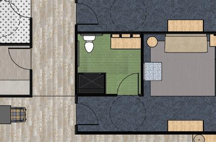 Blue, green, and yellow tones create feelings of security, safety, and harmony within the resident bedrooms.