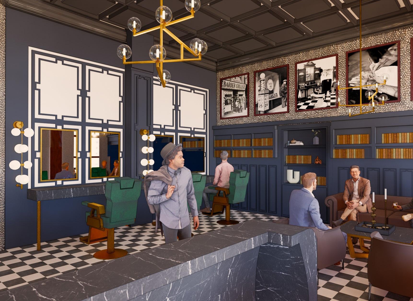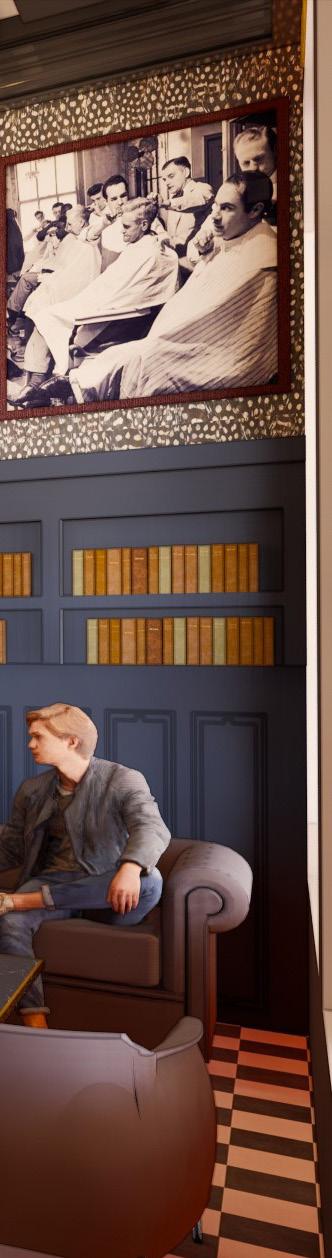 Within the custom casework, a door from the barber shop conceals a prohibition style speakeasy that serves as a private dining area and bar.