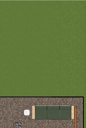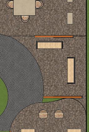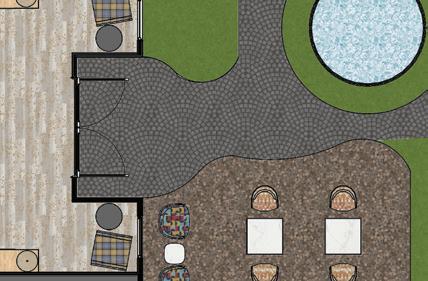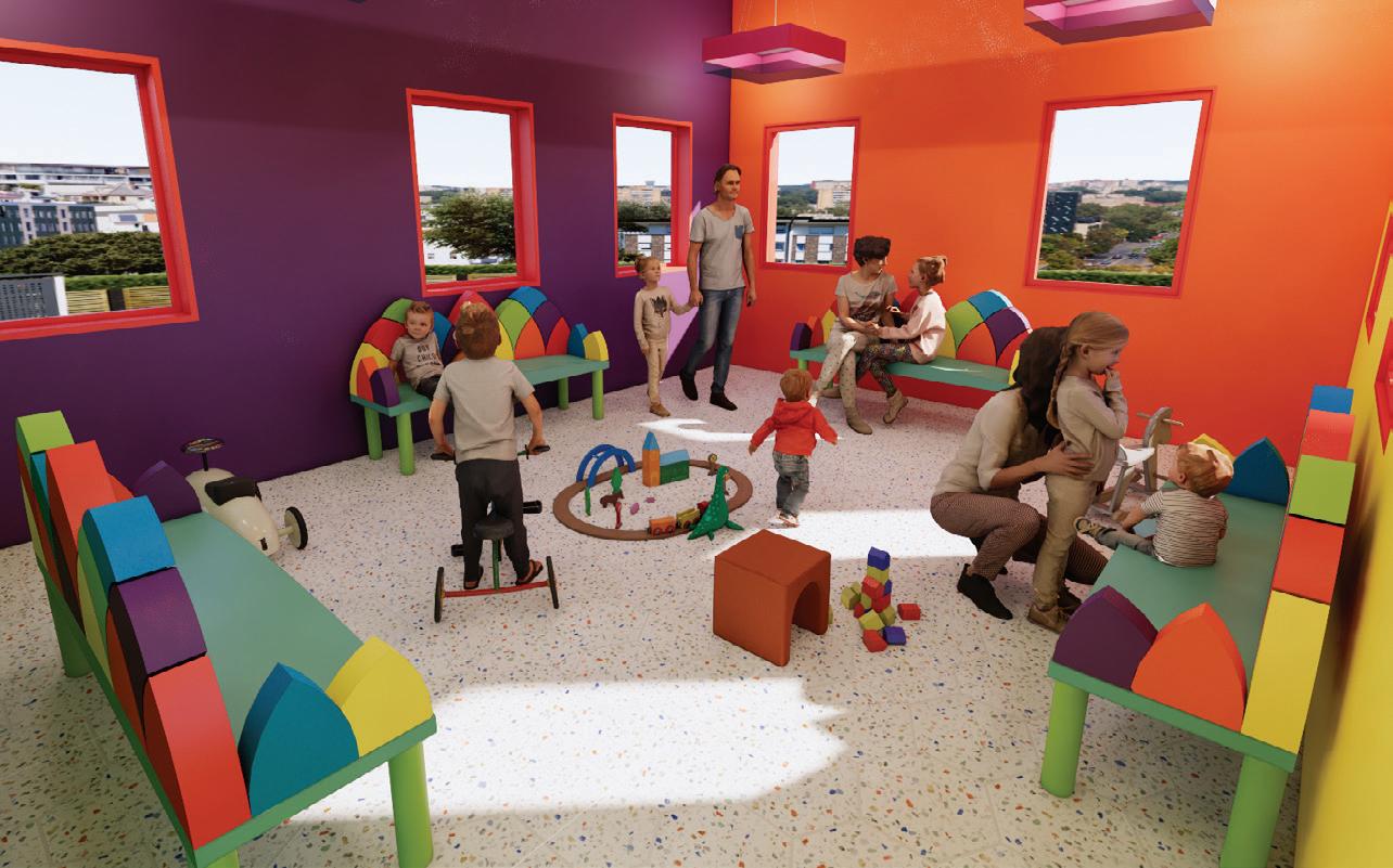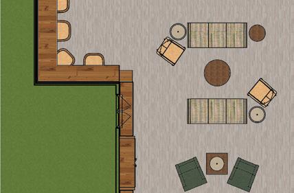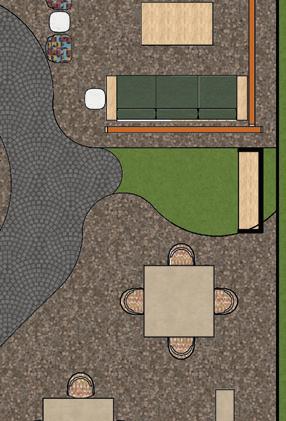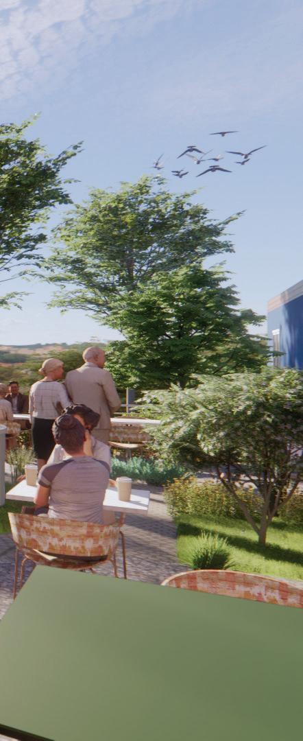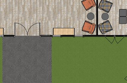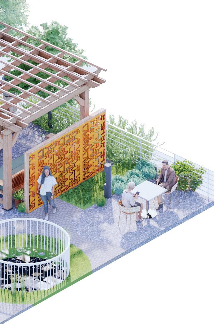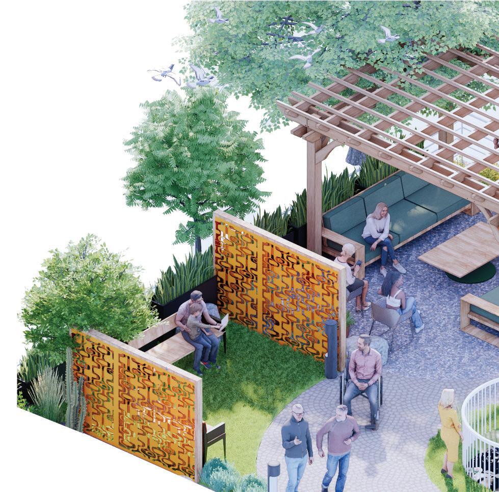 Outdoor garden provides serene space for residents and their families to relax. Green and orange indicate nature, youth, optimism, and health.