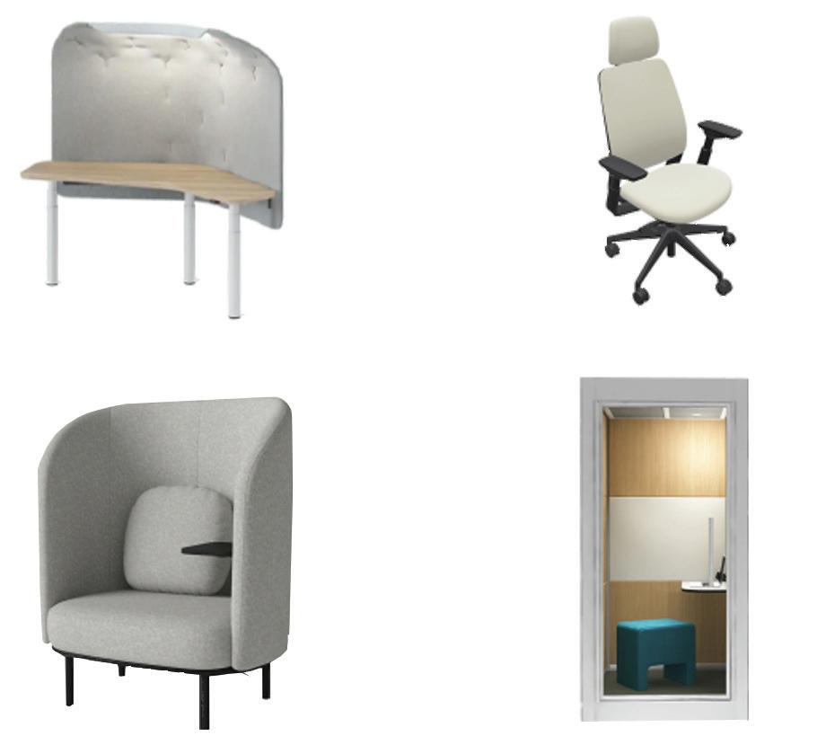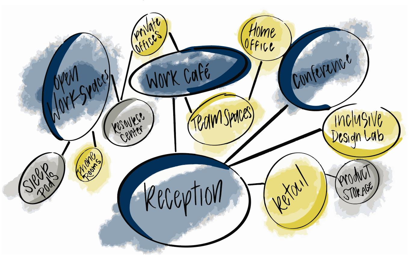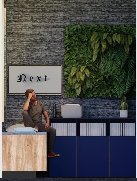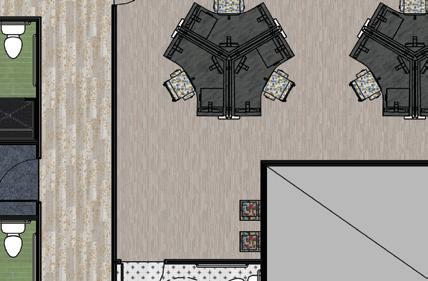 walls & surfaces for visually and sizes of furniture & for wayfinding, wheelchair ergonomic furniture for staff and produces overall higher mood. Implementation of lighting eliminates spread of