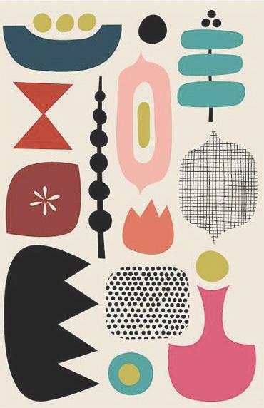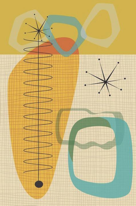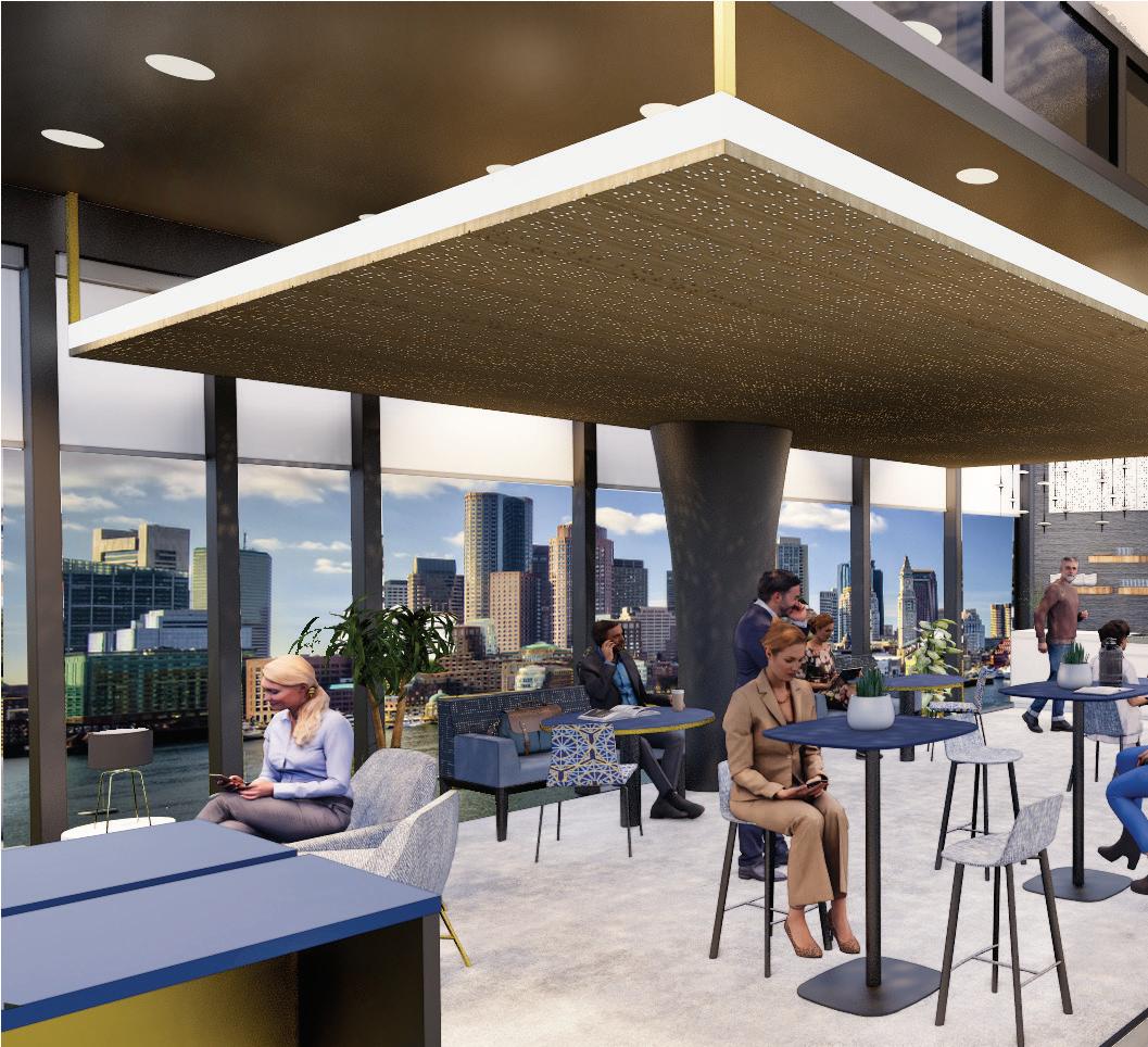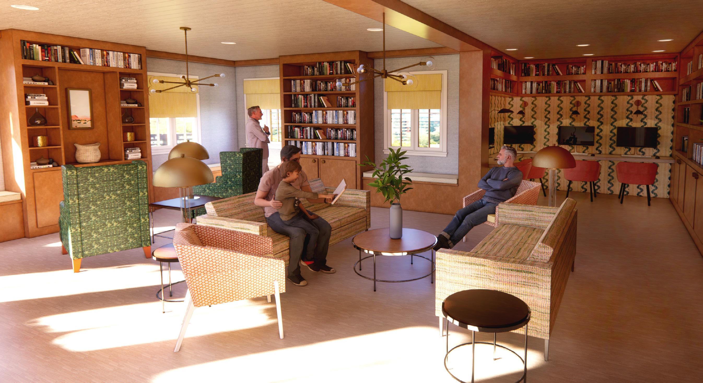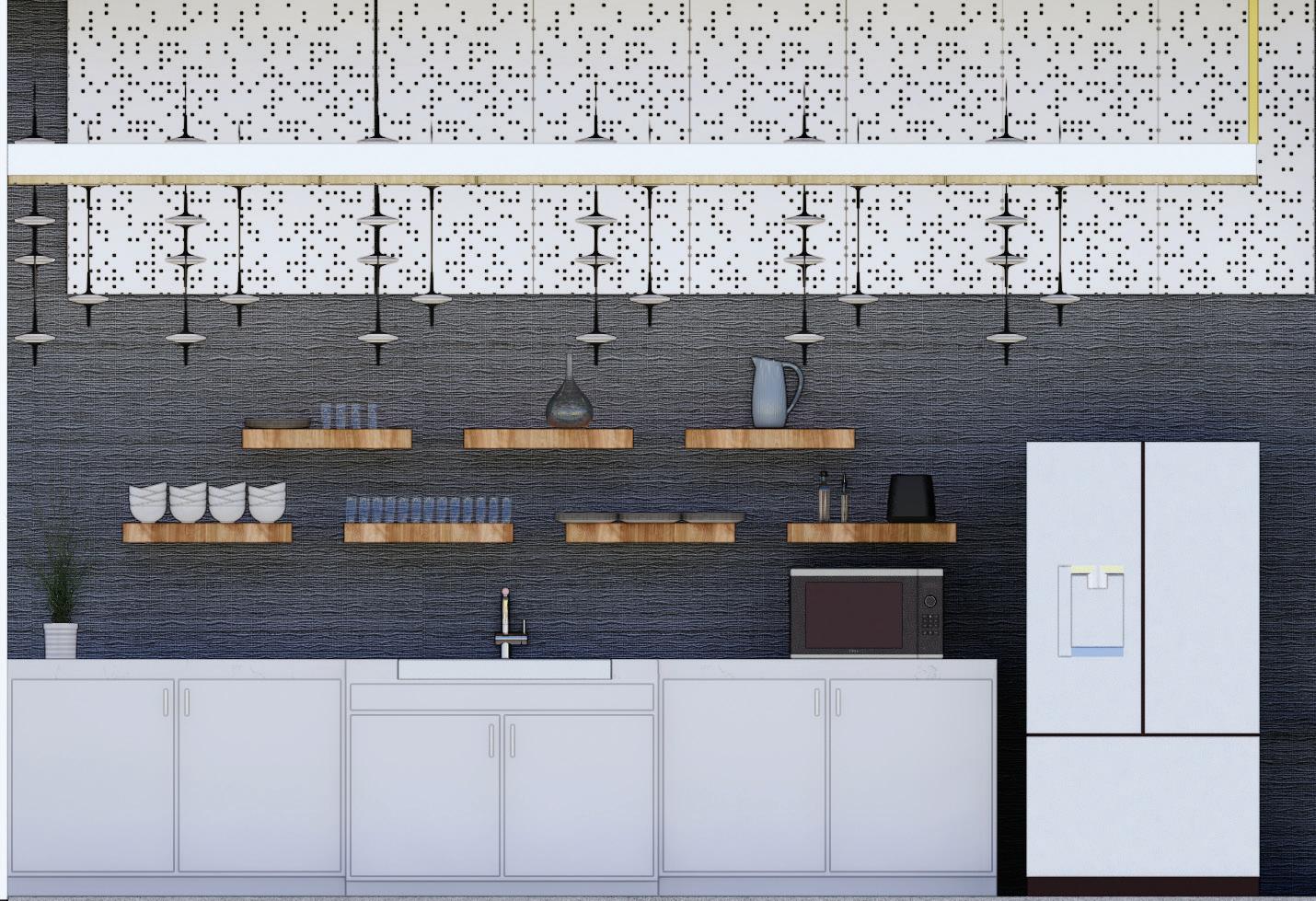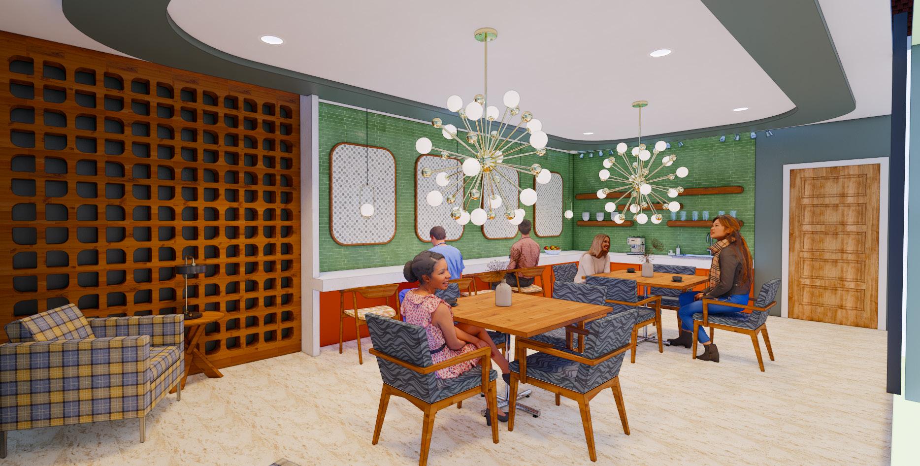Mid-century modern features such as atomic structured light fixtures and geometric patterns create warm and home-like environment for staff to take a break from work.