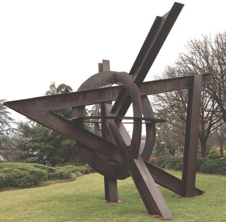 Custom geometric lighting fixture represents elements of space and light through repetition of Art Deco shape and gold color.