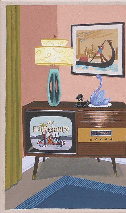 Arch casing along back wall introduces the motif of curvature. The casing uses dark wood and natural cream tones, portraying Nick Carraway’s cottage.