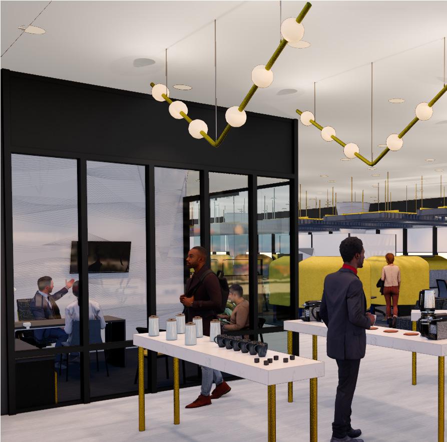Star inspired gold and midnight sky inspired navy create contrast and weave branding throughout the space.