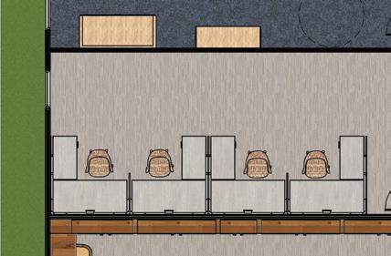 Curvature creates designated space for personal items during classes and simulates the stretches of sand and salt in the Utah landscape.