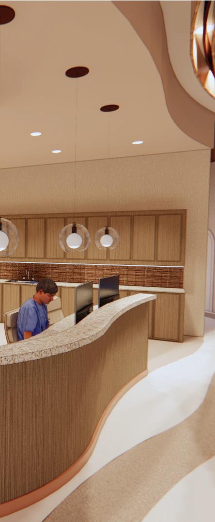 Corridor around the nurses’ station and rooms incorporates a wooden lit alcove to create a way-finding tool both above and below to match the guided flooring material.