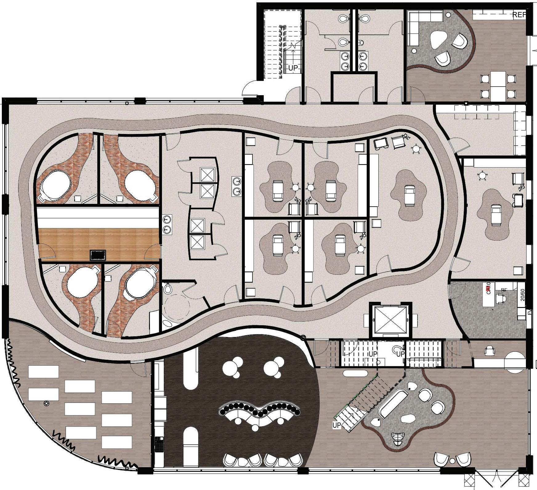First Floor NTS. Lobby Juice Bar and Cafe Yoga Studio Locker Room Salt Pool Treatment Room Staff LoungeDESIGN. enhancement of creativity, and expedited healing. Biomorphic resemble nature, referencing to within Utah.