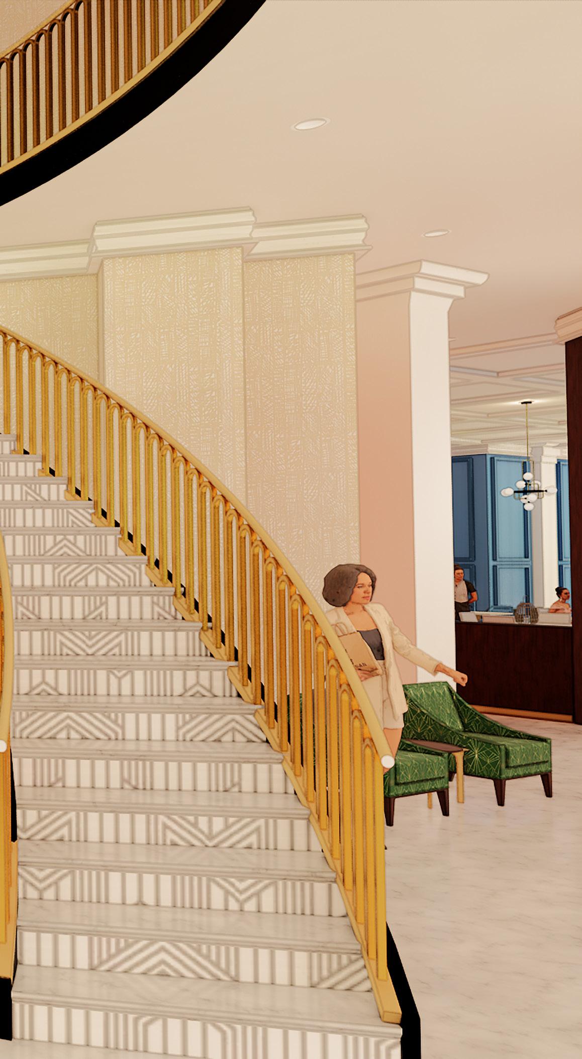 Custom stair rails are intricately designed for the grand stair, consistent with 1920s inspired pattern.