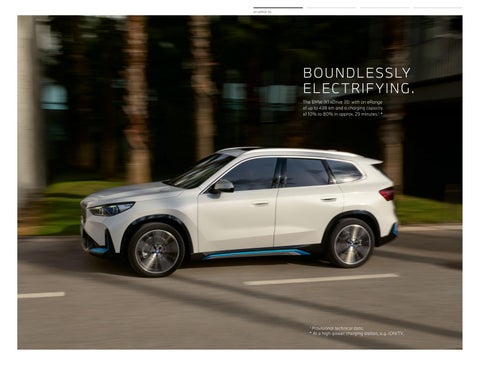 ELECTRIFYING. The BMW iX1 xDrive 30: with an eRange of up to 438 km and a charging capacity of 10% to 80% in approx. 29 minutes.1, * iX1 xDRIVE 30. Provisional technical data. * At a high-power charging station, e.g. IONITY.