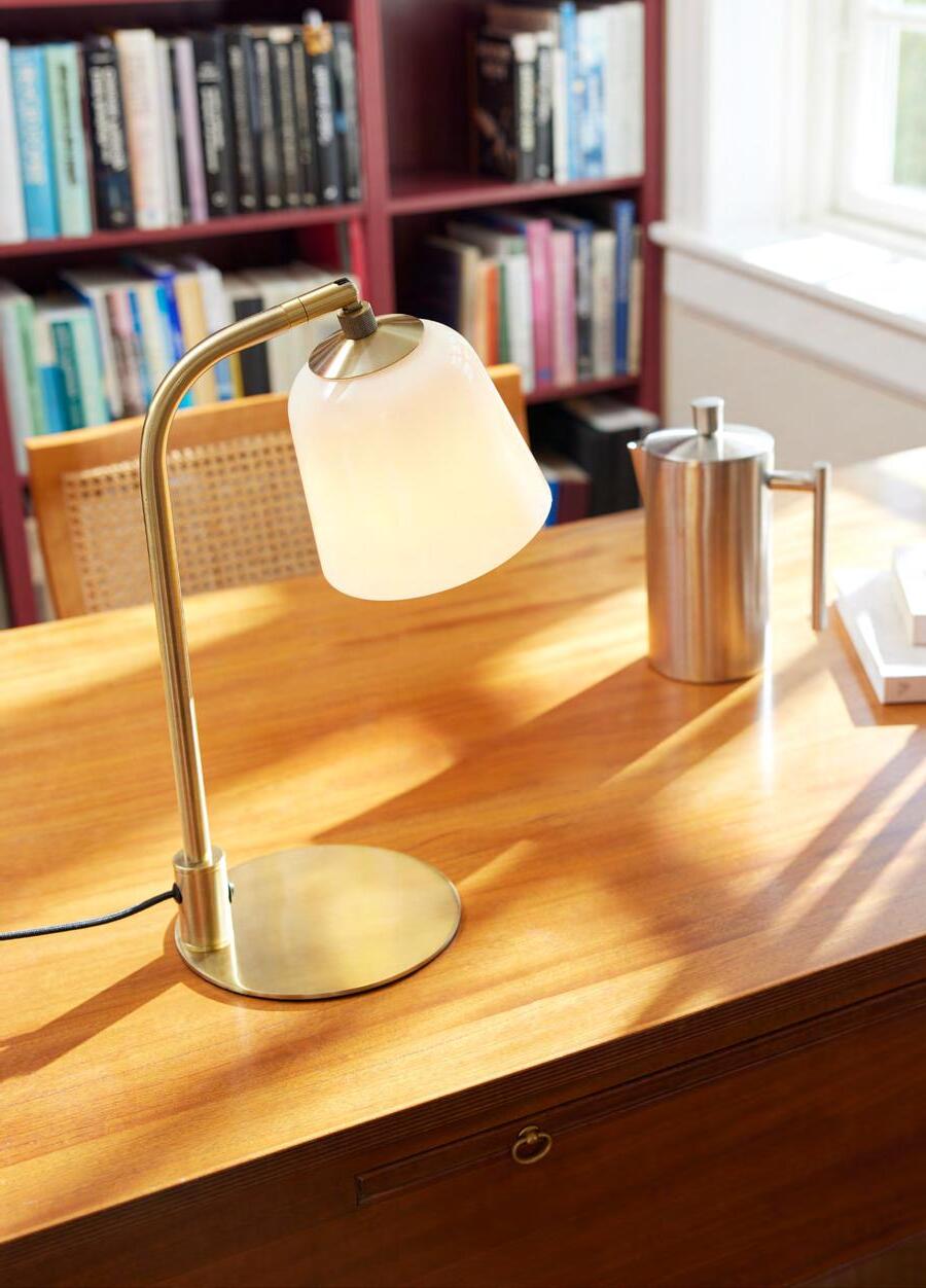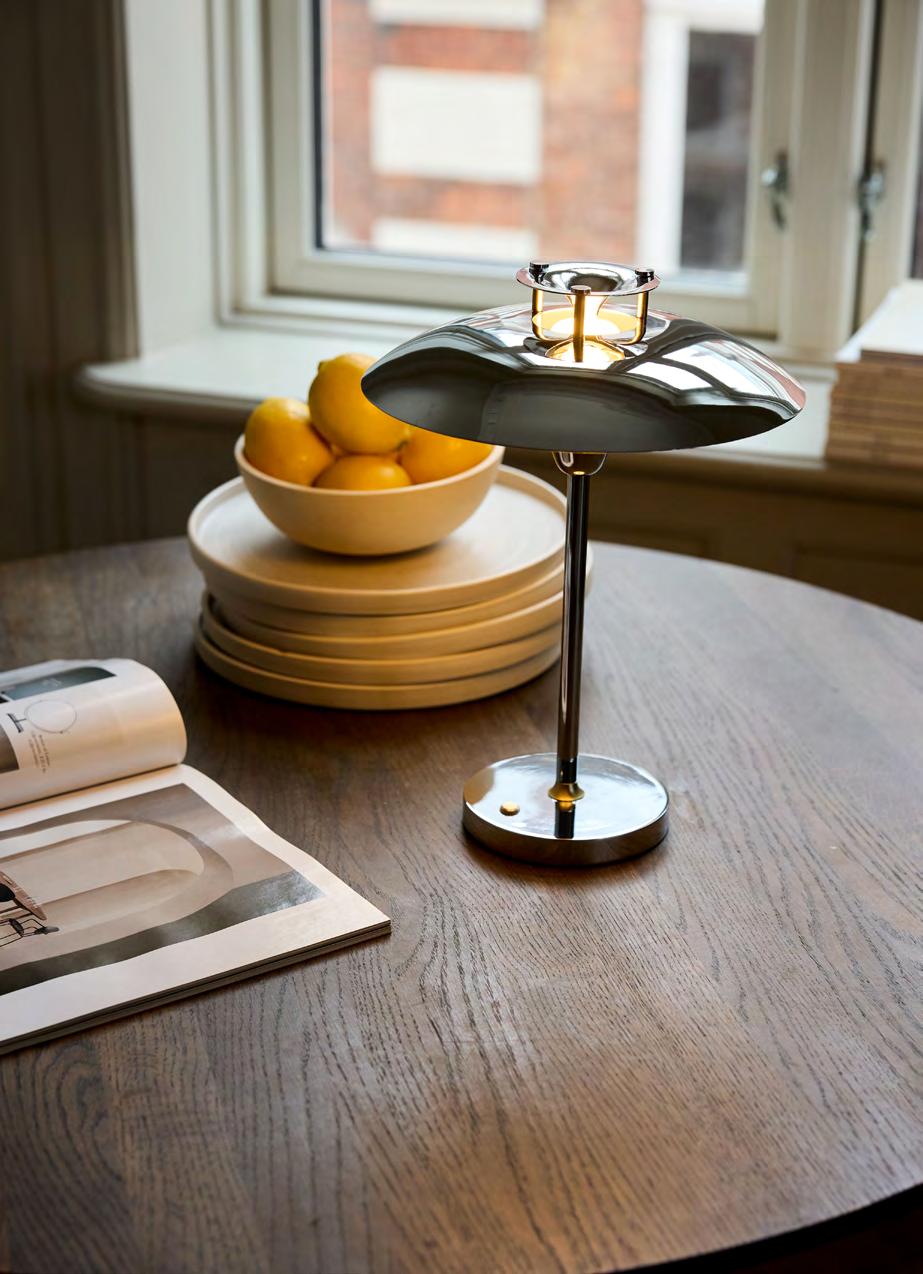 This portable lamp combines modernity and a classic design with walnut veneer and brass details. Thanks to a magnetic connection and its spherical shape, it allows the luminaire to rotate at will to optimise the direction of the light.