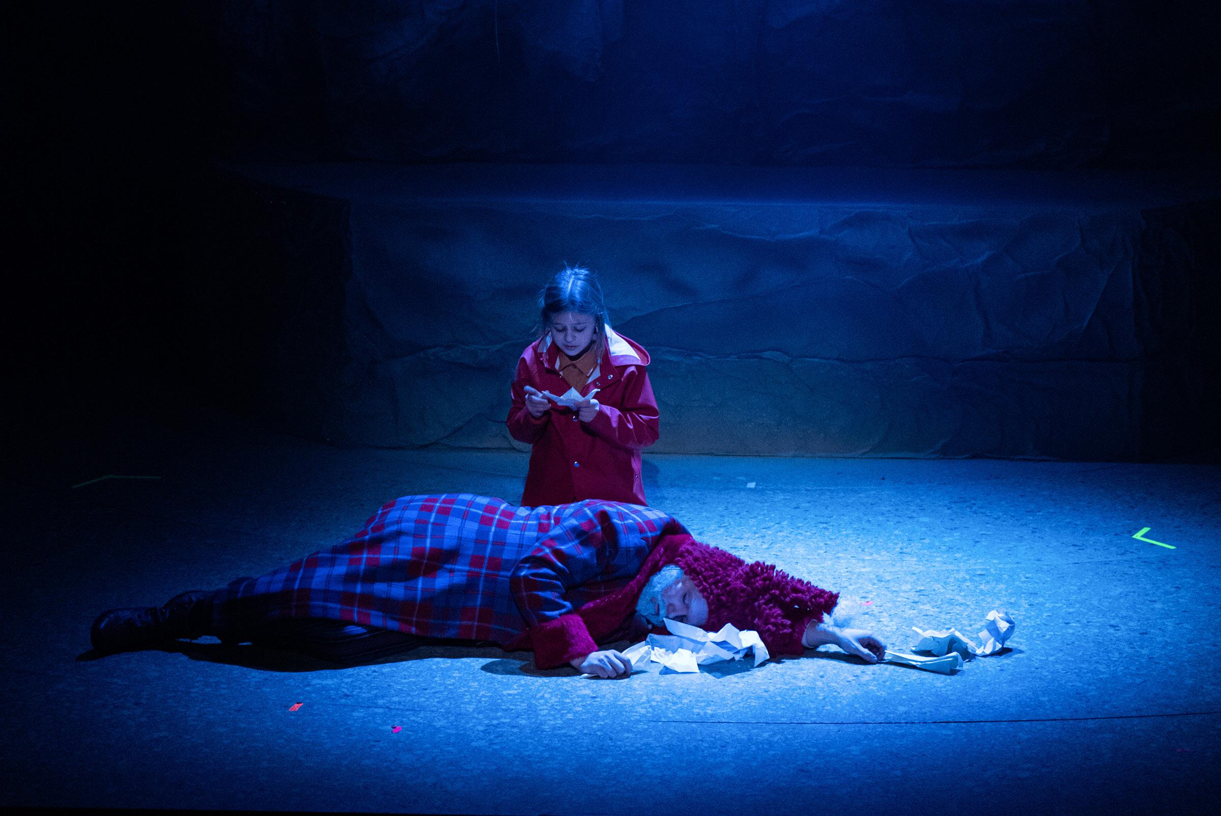 Scene 14 Snøfall: Winter fanger Julius Winter lurer Julius inn i Mørket. Selma våkner og ser at Julius er borte. FORESTILLINGEN, SCENE FOR SCENE #HALOGALANDTEATER