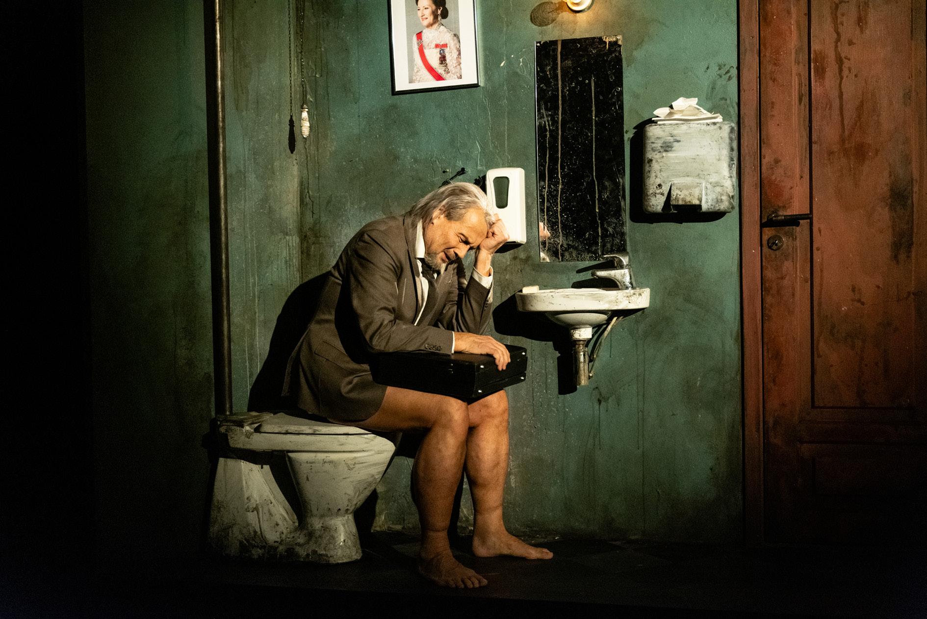 Sceneskift til toalettet hvor Herman tørker buksa si. Han snakker for seg selv
